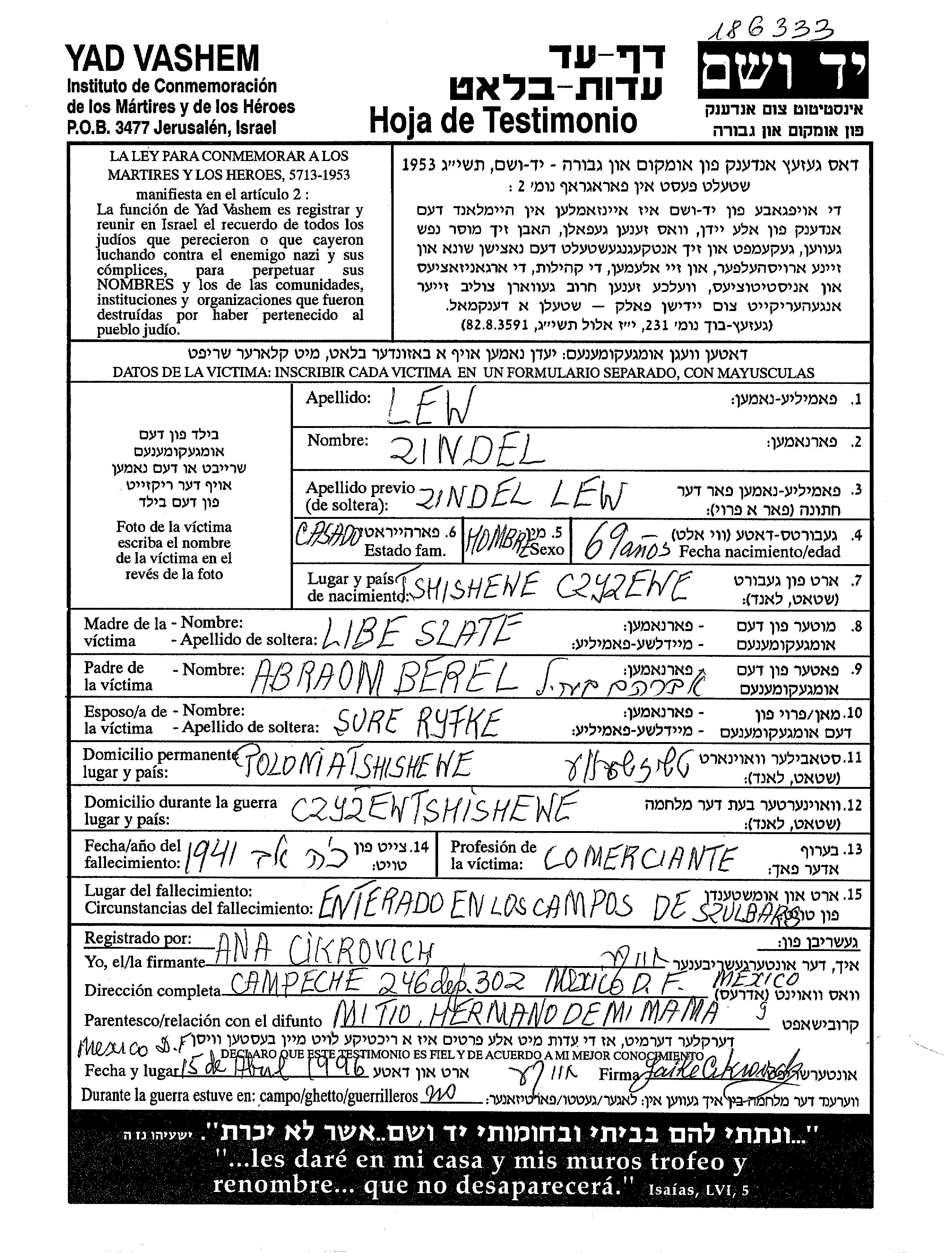 Zindel Lew wurde im Jahr 1872 in Czyzewo, Polen geboren. Er war der Sohn von Abraham Berl und Liba Zlate. Er war Kaufmann/-frau und mit Sure Ryfke Verheiratet. Vor dem Zweiten Weltkrieg lebte er in Czyzewo, Polen. Während des Krieges war er in Czyzewo, Polen.
