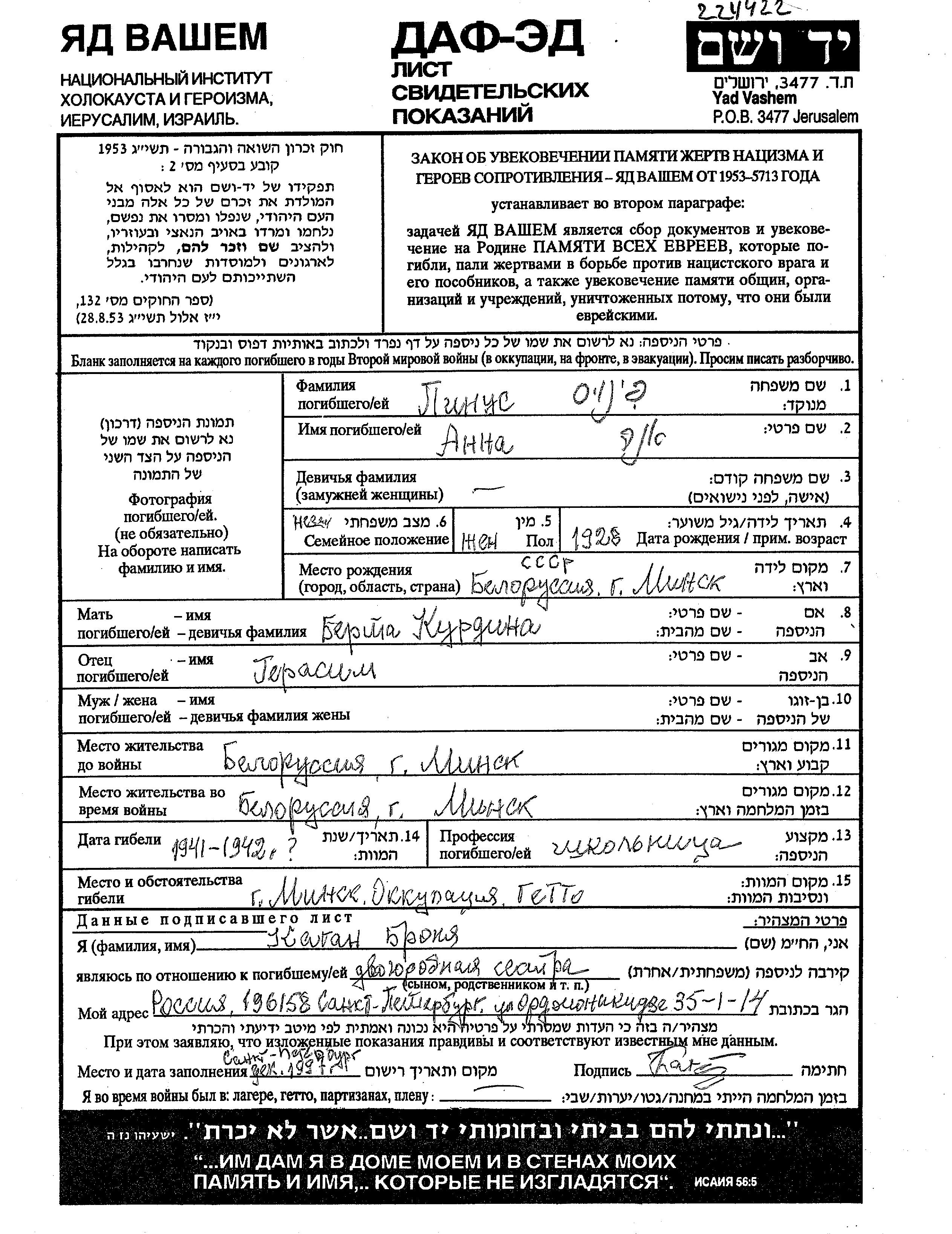 Ana Pinus wurde im Jahr 1928 in Minsk, Weißrussland (UdSSR) geboren. Sie war die Tochter von Gerasim und Berta, geb. Kurdin. Sie war Schüler/-in und Kind. Vor dem Zweiten Weltkrieg lebte sie in Minsk, Weißrussland (UdSSR). Während des Krieges war sie in Minsk, Weißrussland (UdSSR).