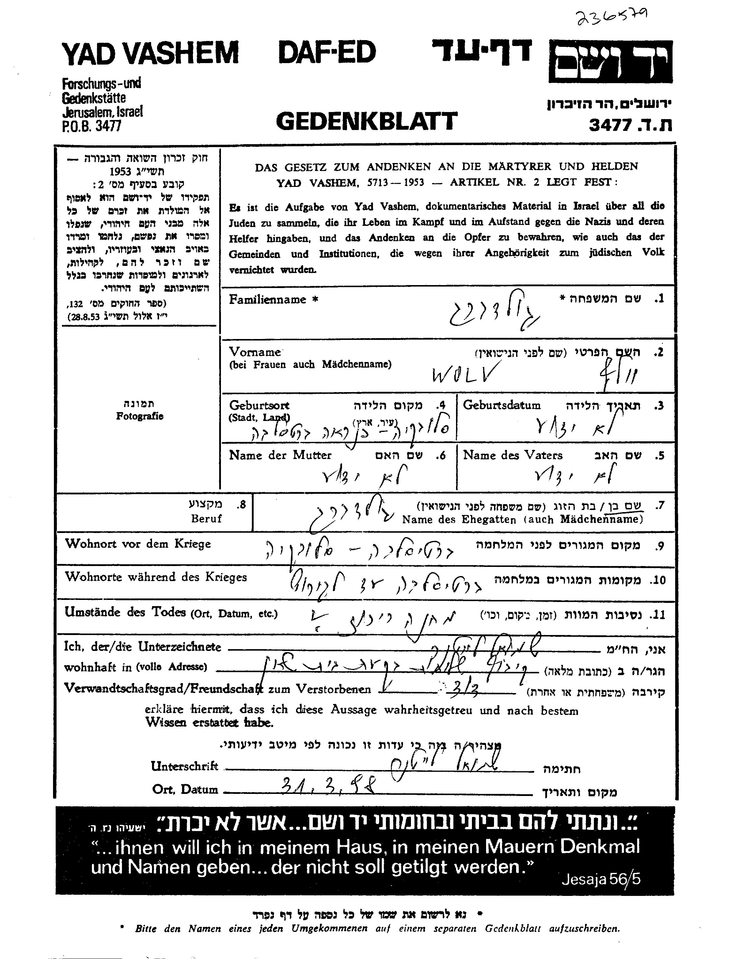 Wolv Goldberg wurde in Slovakia, Tschechoslowakei geboren. Er war mit Ester Verheiratet. Vor dem Zweiten Weltkrieg lebte er in Bratislava, Tschechoslowakei. Während des Krieges war er in Bratislava, Tschechoslowakei.