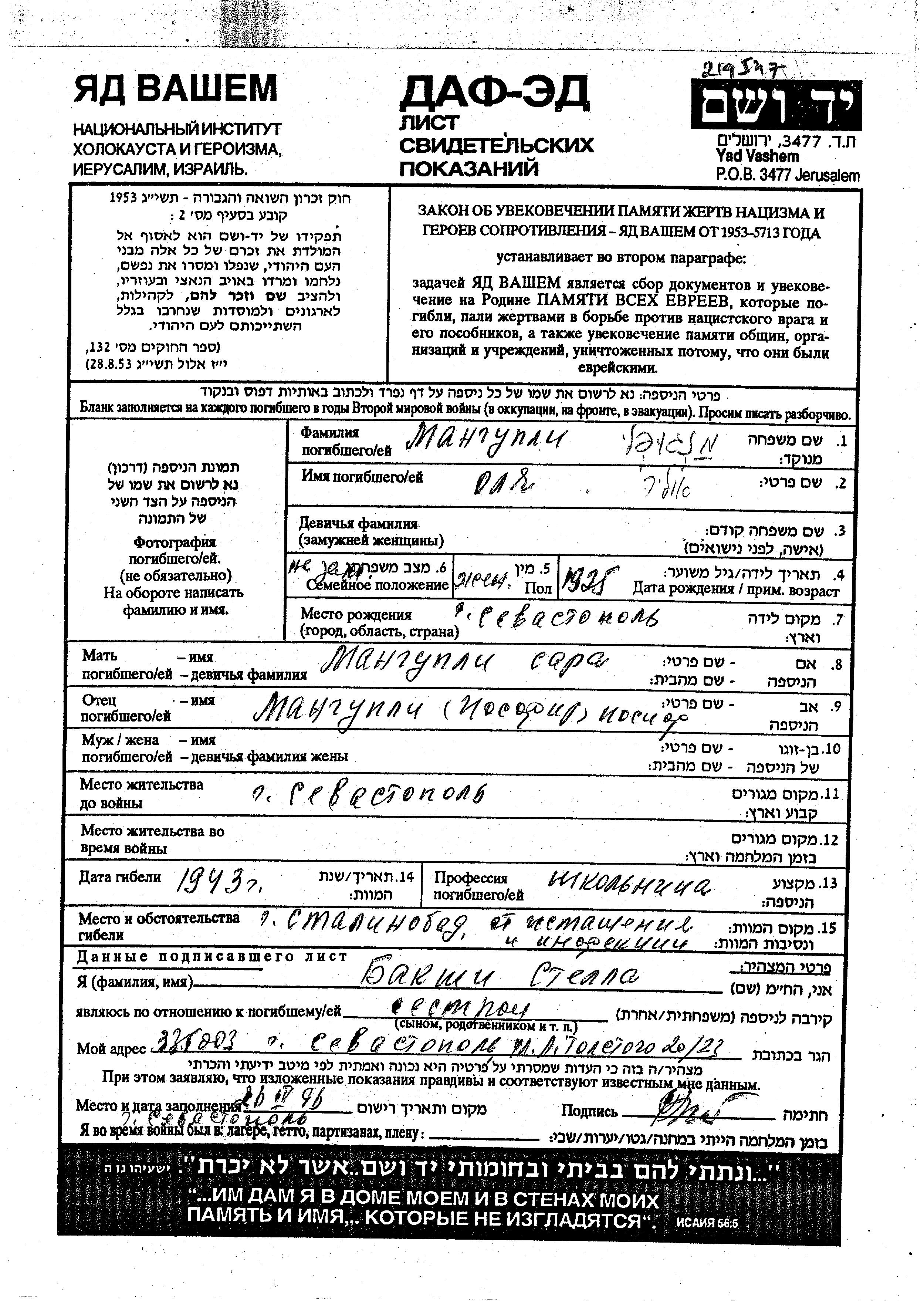 Olya Mangupli wurde im Jahr 1925 in Sevastopol, Russland (UdSSR) geboren. Sie war die Tochter von Iosif und Sara, geb. Bakshi. Sie war Schüler/-in und Ledig. Vor dem Zweiten Weltkrieg lebte sie in Sevastopol, Russland (UdSSR). Olya wurde nach der Evakuierung/ ins Innere der Sowjetunion registriert.