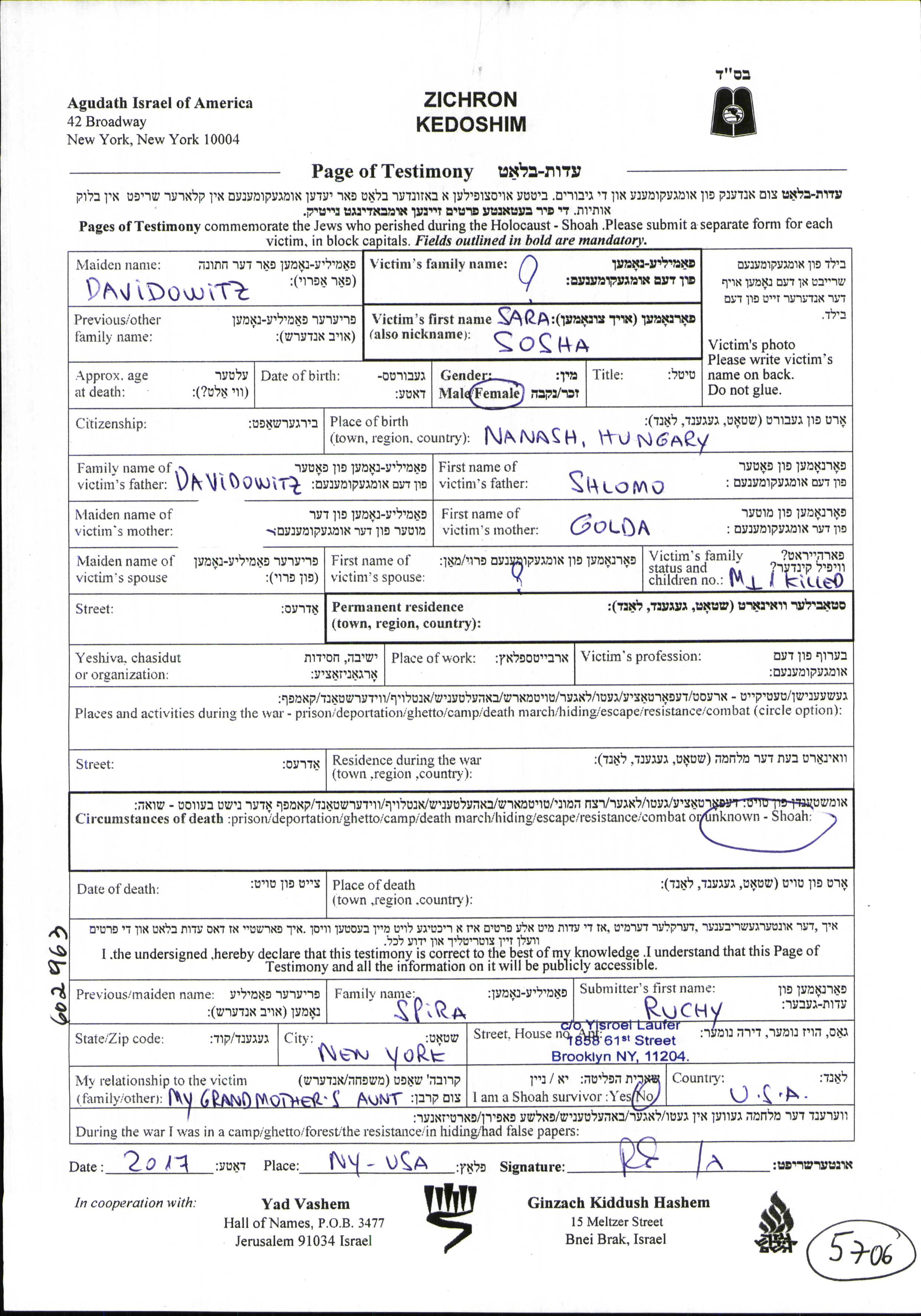 Sara Susha Name unbekannt, geb. Davidowitz wurde in Hajdunanas, Ungarn geboren. Vor dem Zweiten Weltkrieg lebte sie in Sajoszentpeter, Ungarn.
