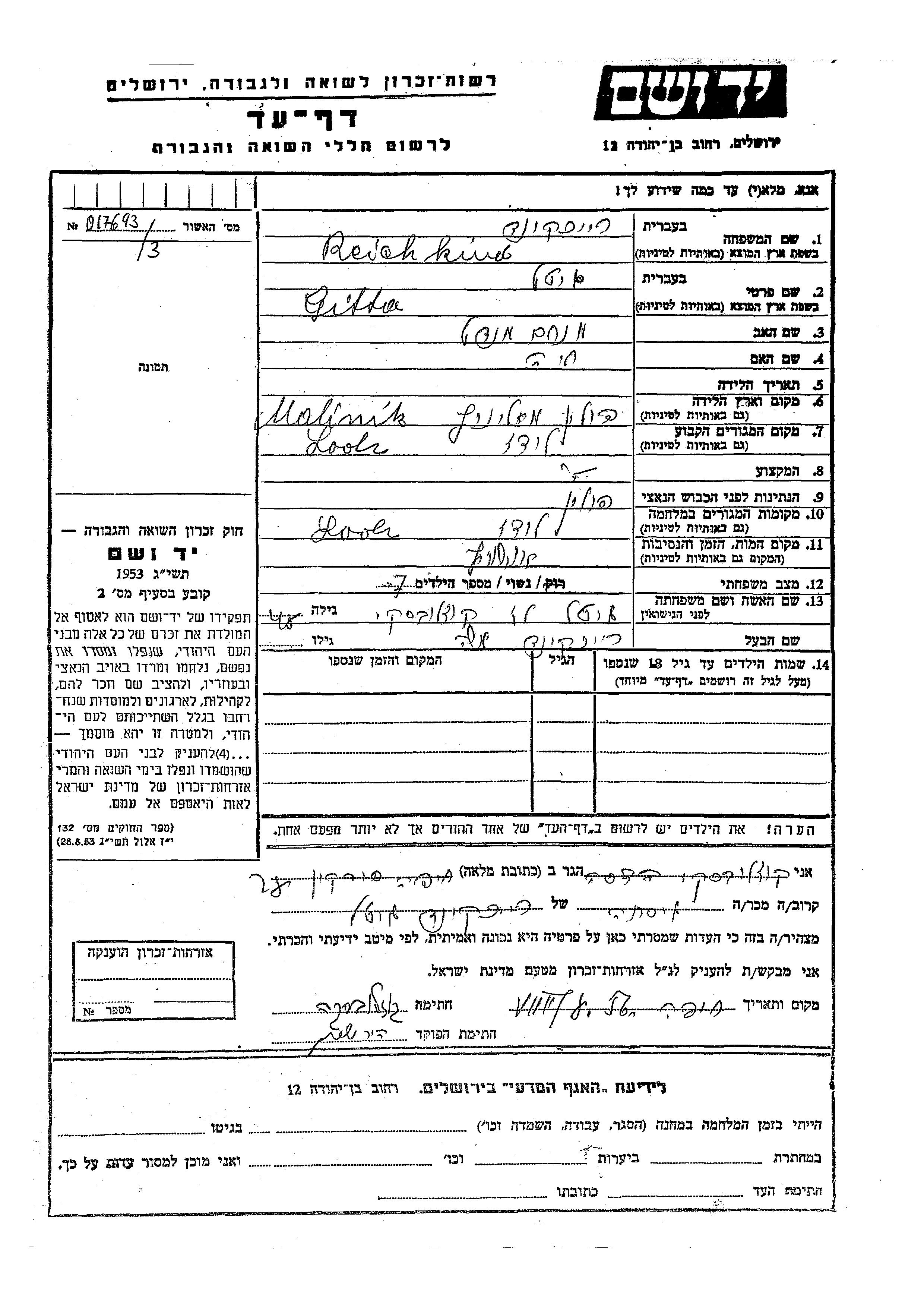 Gitla Reikhkind, geb. Kozlowska Karlowska wurde im Jahr 1887 in Maliniec, Polen geboren. Vor dem Zweiten Weltkrieg lebte sie in Lodz, Polen.