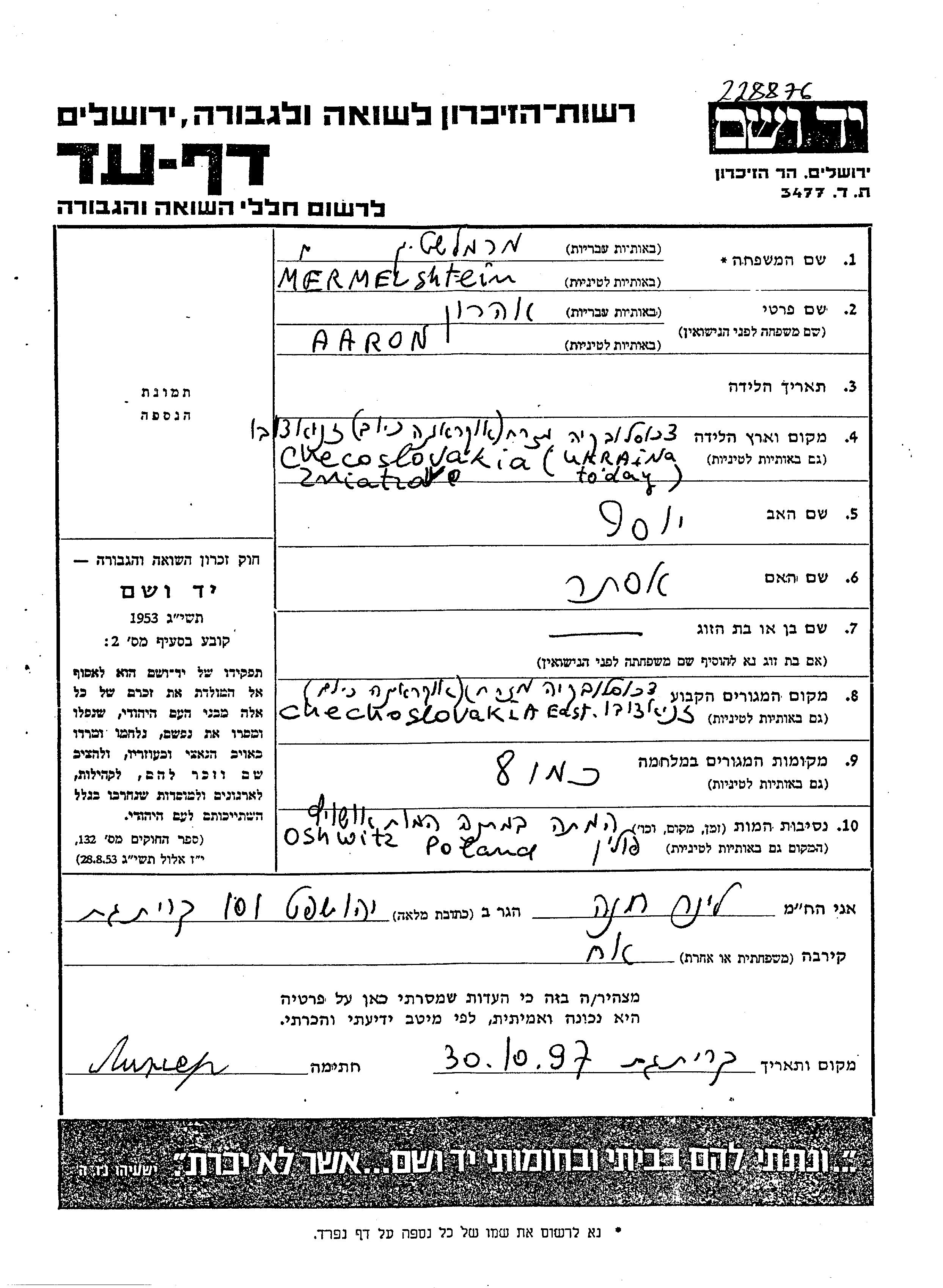 Aaron Mermelshtain wurde in Znacovo, Tschechoslowakei geboren. Er war der Sohn von Yosef und Ester, geb. Fridman. Vor dem Zweiten Weltkrieg lebte er in Znacovo, Tschechoslowakei. Während des Krieges war er in Dubrovka, Tschechoslowakei.