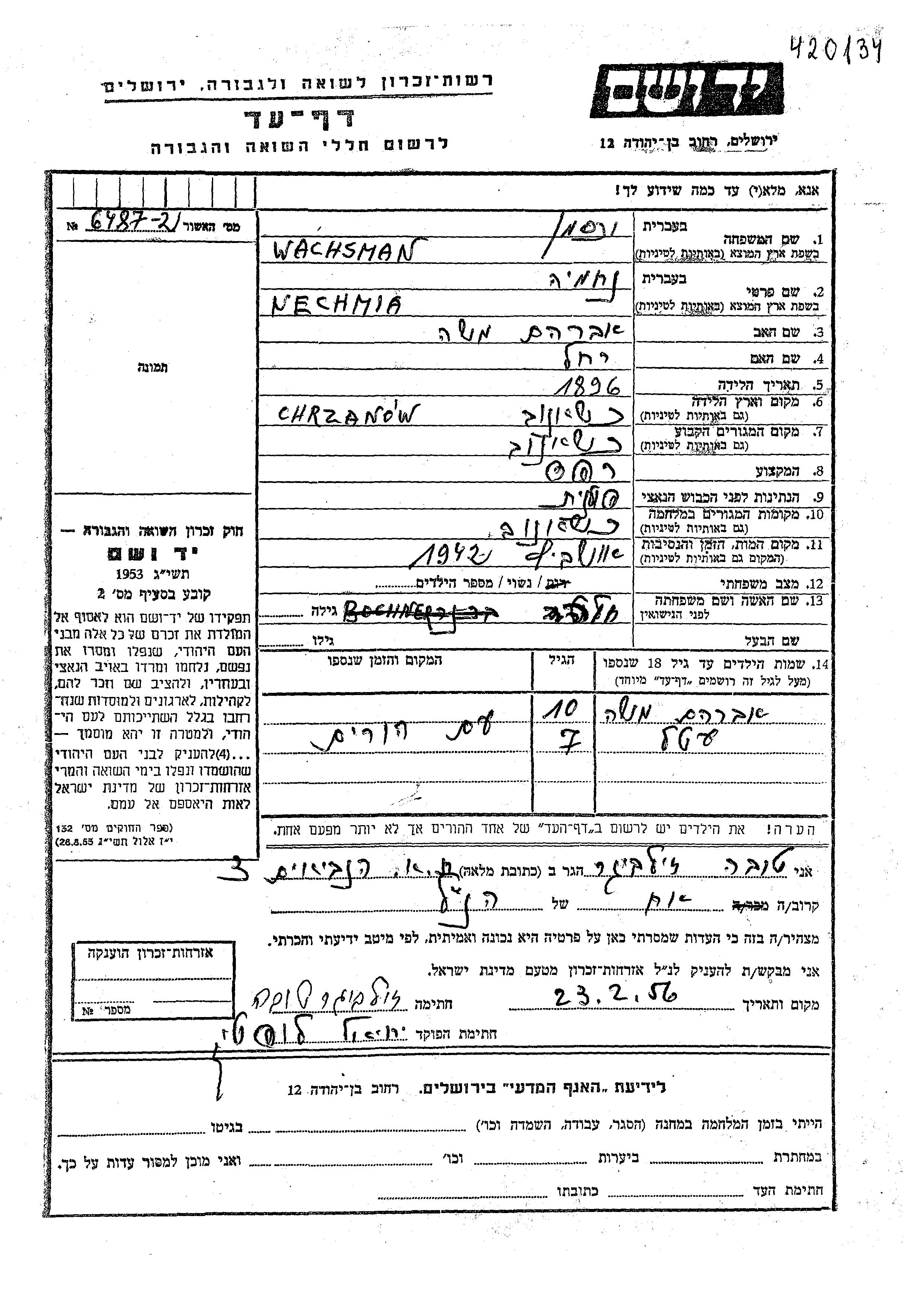 Nechmia Wachsman wurde im Jahr 1896 in Chrzanow, Polen geboren. Er war der Sohn von Avraham Moshe und Rakhel. Er war Polsterer/-in und Verheiratet. Vor dem Zweiten Weltkrieg lebte er in Chrzanow, Polen. Während des Krieges war er in Chrzanow, Polen.