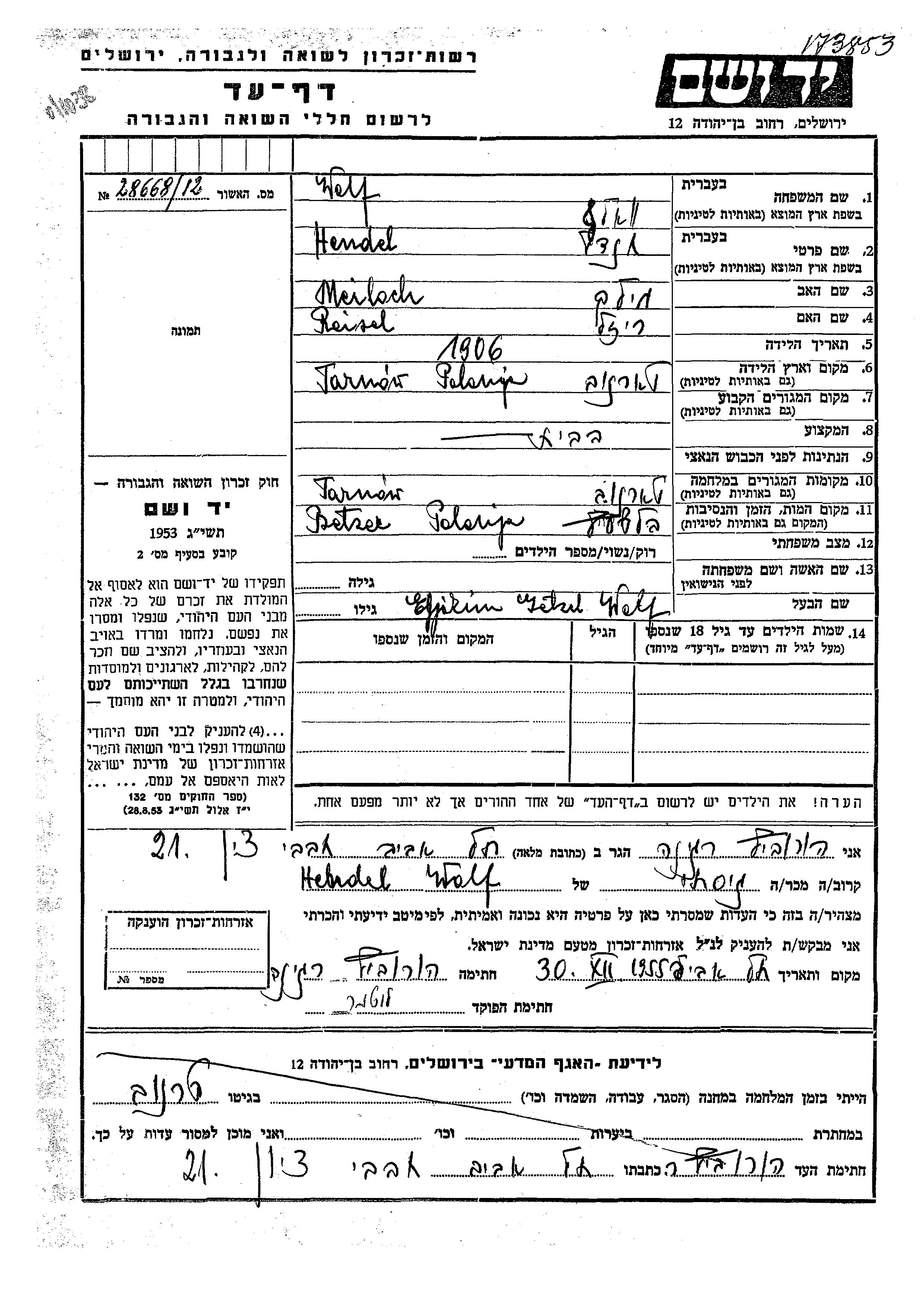 Endel Hendel Welz Voltz wurde im Jahr 1906 in Tarnow, Polen geboren. Sie war die Tochter von Meiloch und Reizl. Sie war Hausfrau und mit Getzel Verheiratet. Während des Krieges war sie in Tarnow, Polen.