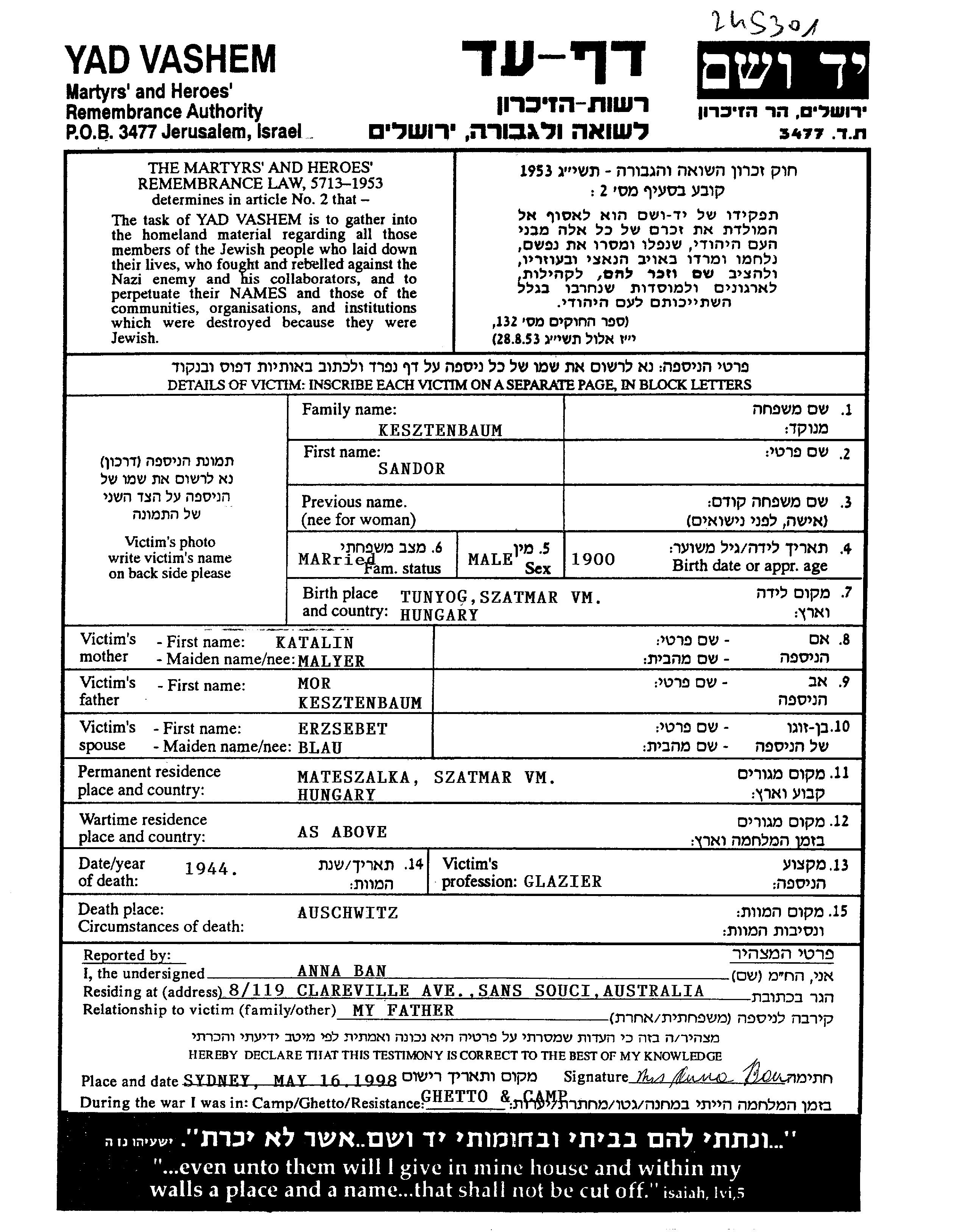 Sandor wurde in der Schoah ermordet. Todesort: Auschwitz, Polen im Jahr 1944.