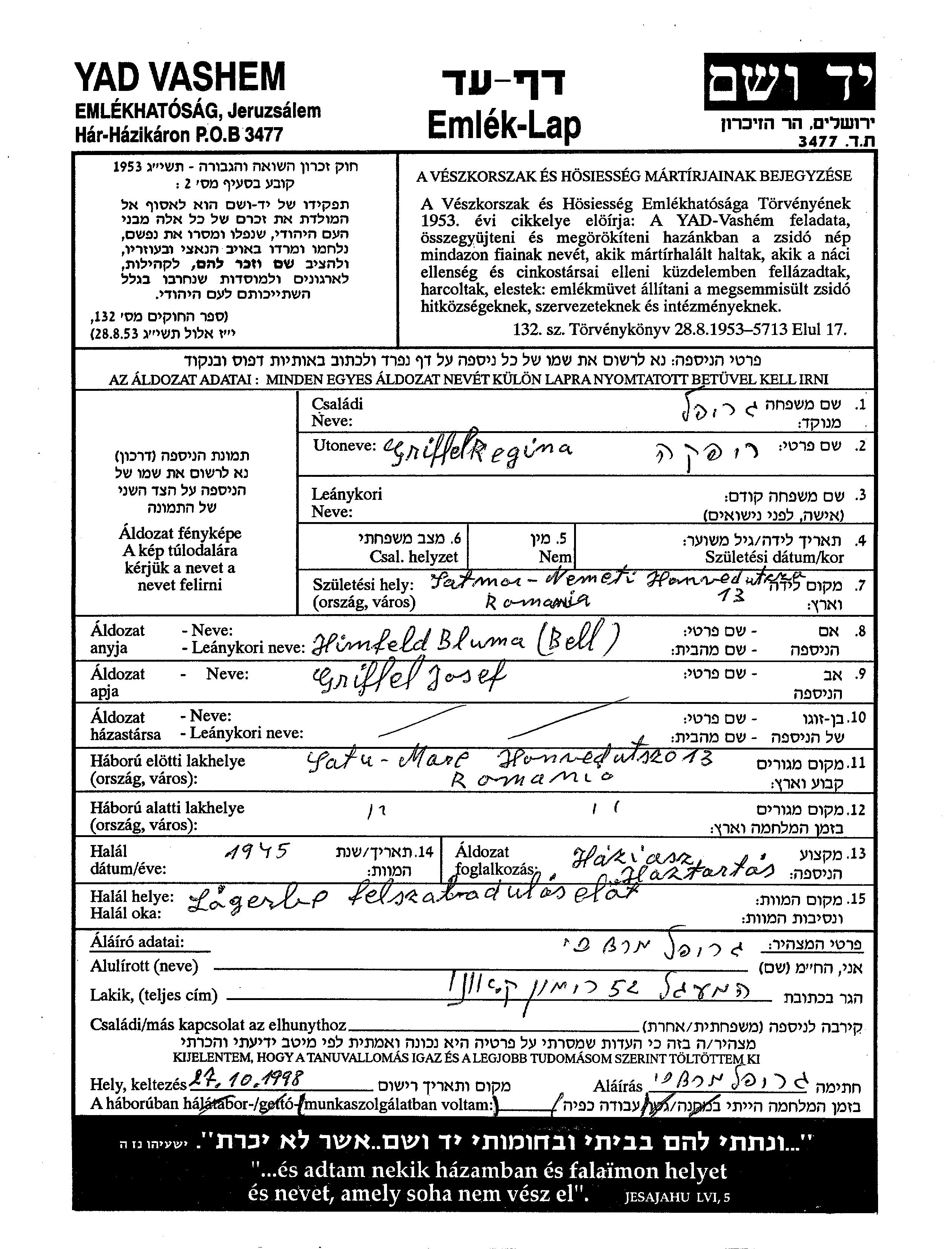 Griffel Rivka Regina Satu Mare, Rumänien Gedenkblatt