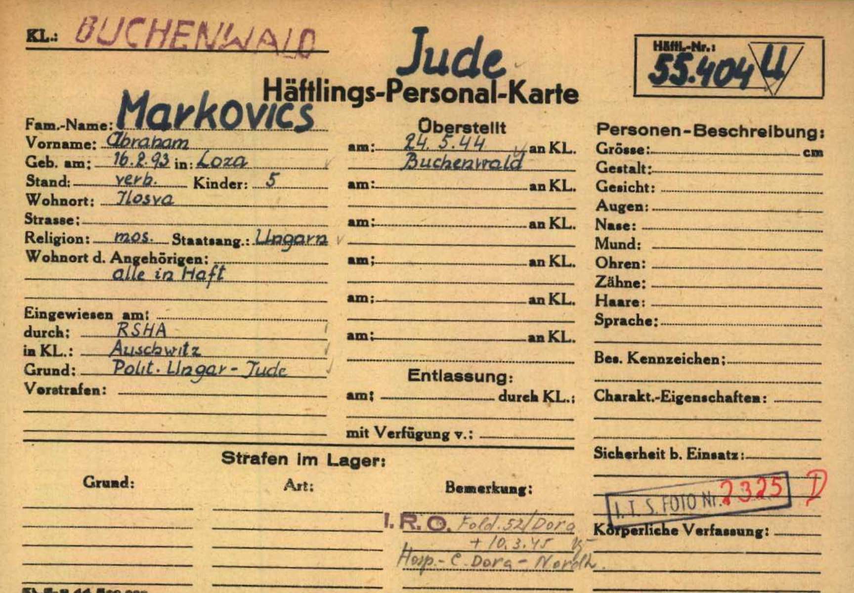 Markovics Avraham 1893 Ilosva, Tschechoslowakei Kartei des Internationalen Suchdienstes Bad Arolsen