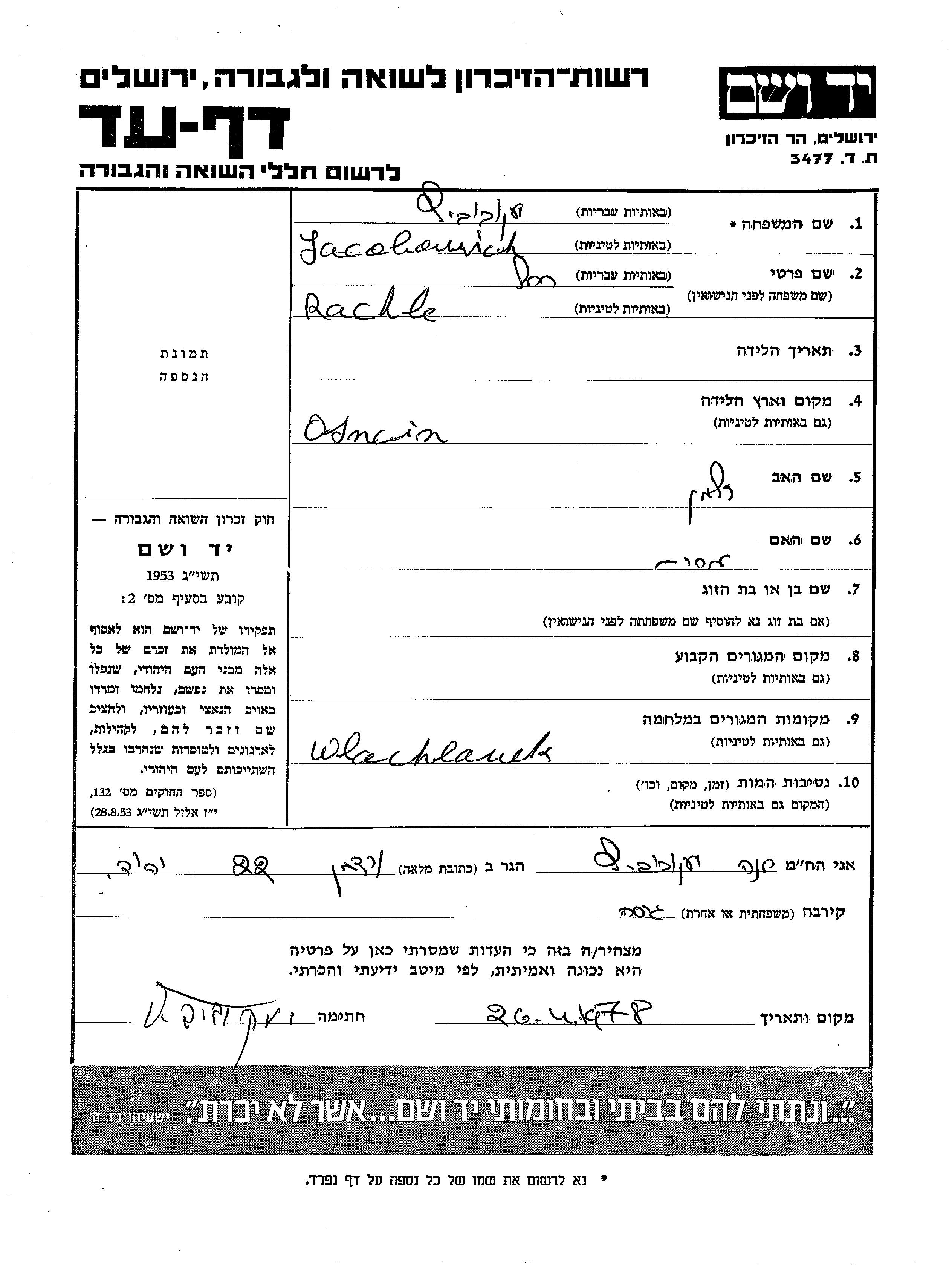 Rachle Jacobowich wurde in Osieciny, Polen geboren. Sie war die Tochter von Zalman und Miriam. Während des Krieges war sie in Wloclawek, Polen.