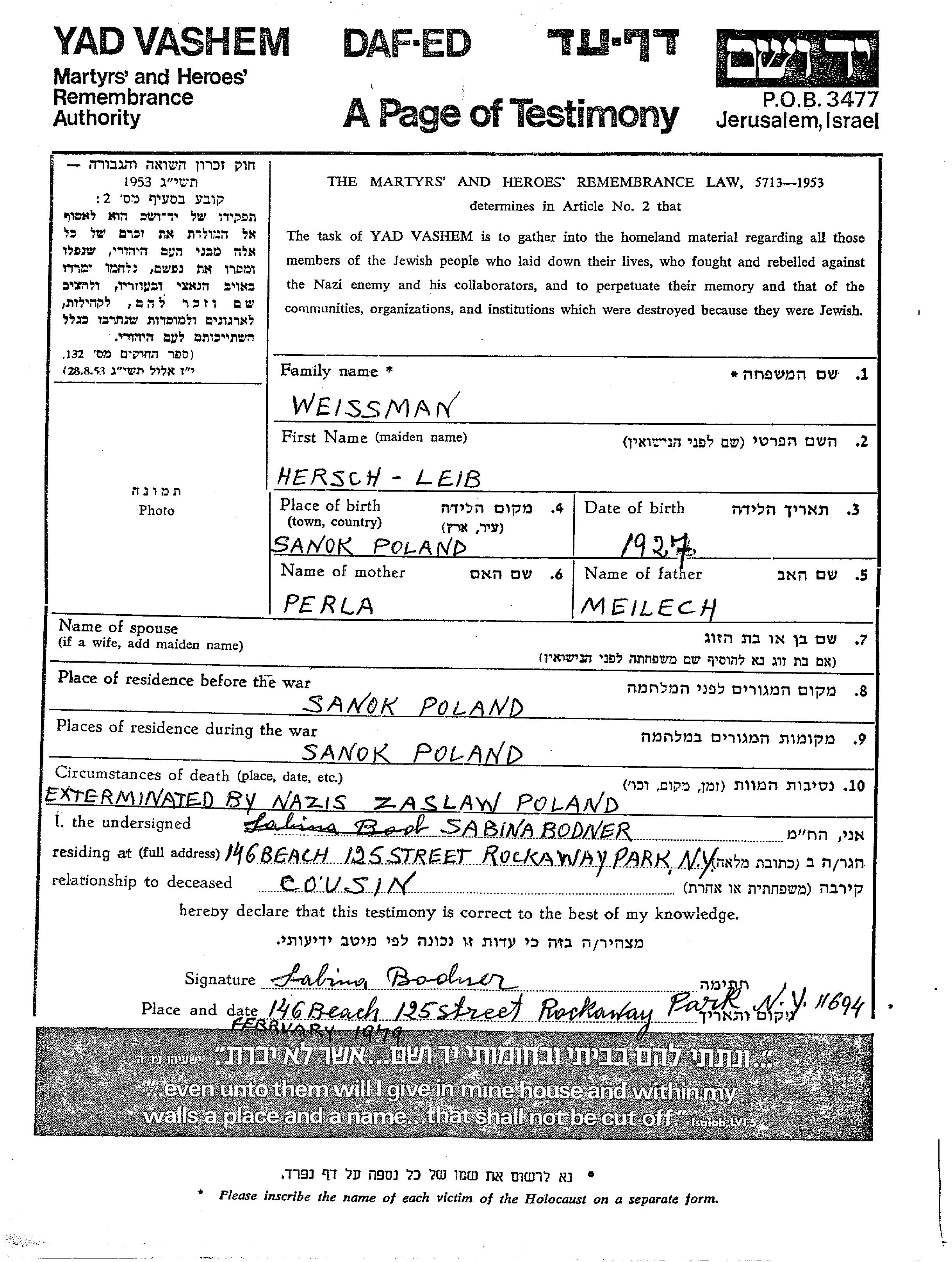 Hersh Leib Veisman wurde im Jahr 1927 in Sanok, Polen geboren. Vor dem Zweiten Weltkrieg lebte er in Sanok, Polen.
