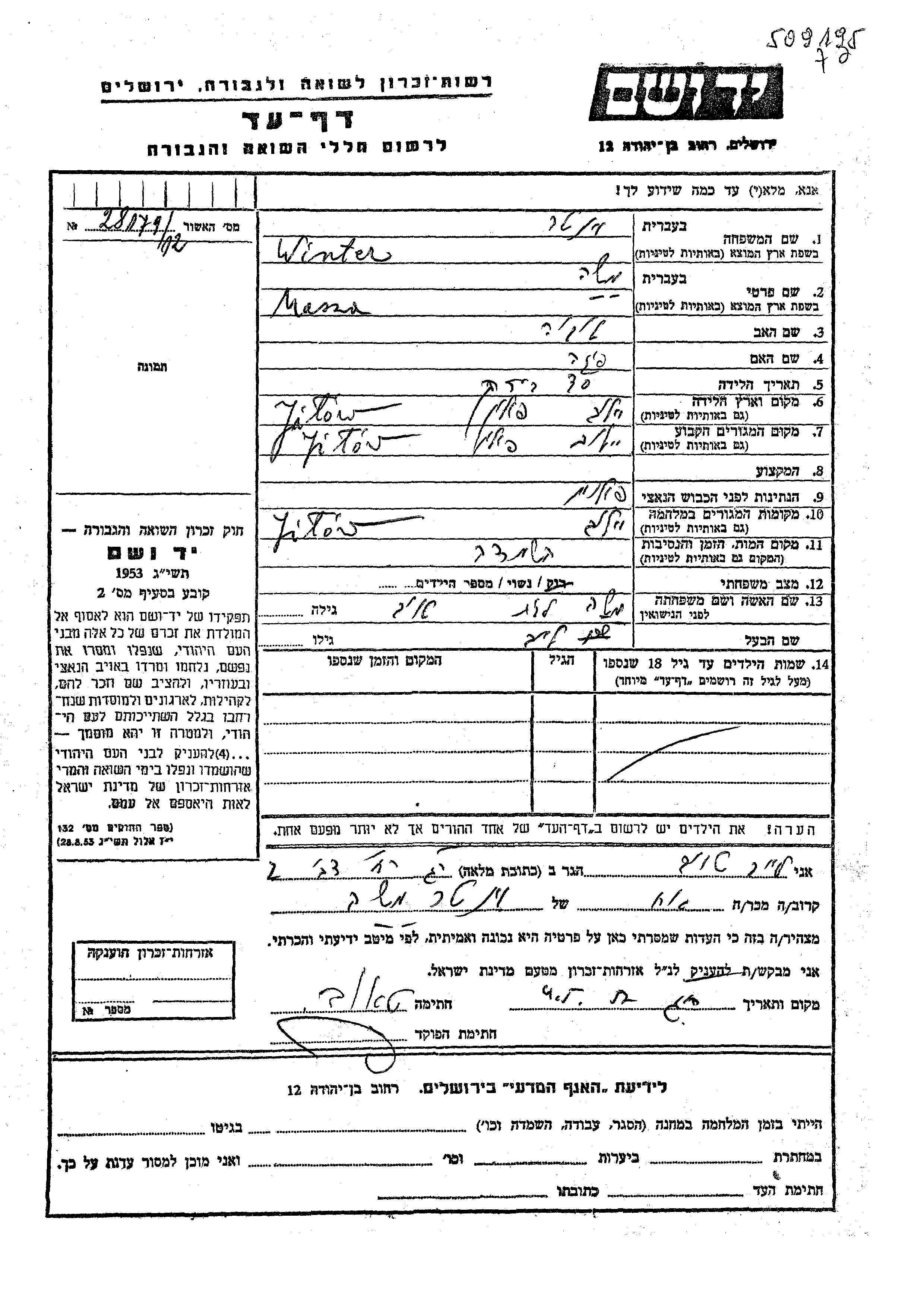 Masza Moshe Winter, geb. Toib wurde in Jilow, Polen geboren. Sie war die Tochter von Tuvia und Feiga. Sie war mit Leib Verheiratet. Vor dem Zweiten Weltkrieg lebte sie in Jilow, Polen. Während des Krieges war sie in Jilow, Polen.