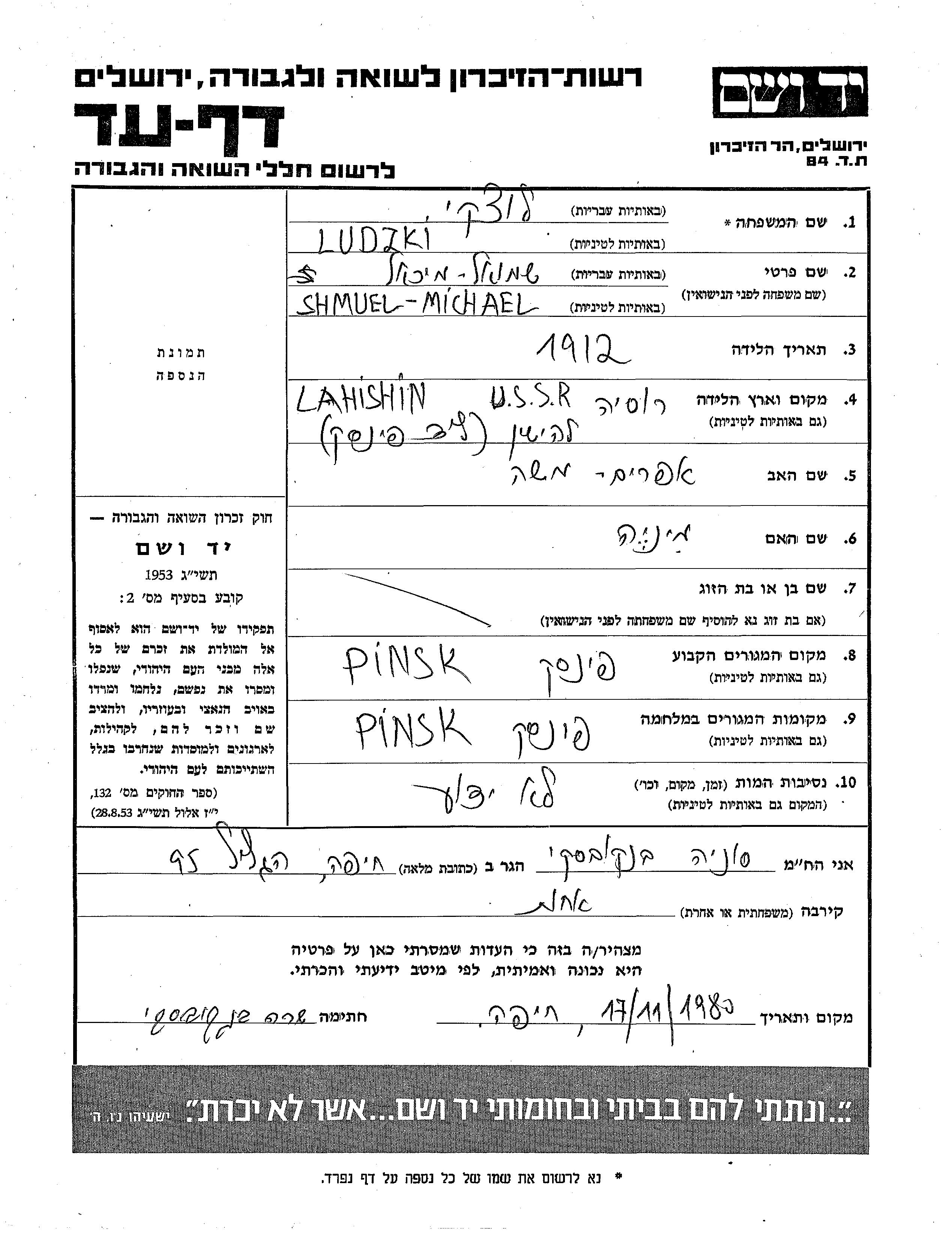 Michael Shmuel Ludzki wurde im Jahr 1912 in Lahiszyn, Polen geboren. Er war der Sohn von Efraim Moshe und Minia. Vor dem Zweiten Weltkrieg lebte er in Pinsk, Polen. Während des Krieges war er in Pinsk, Polen.