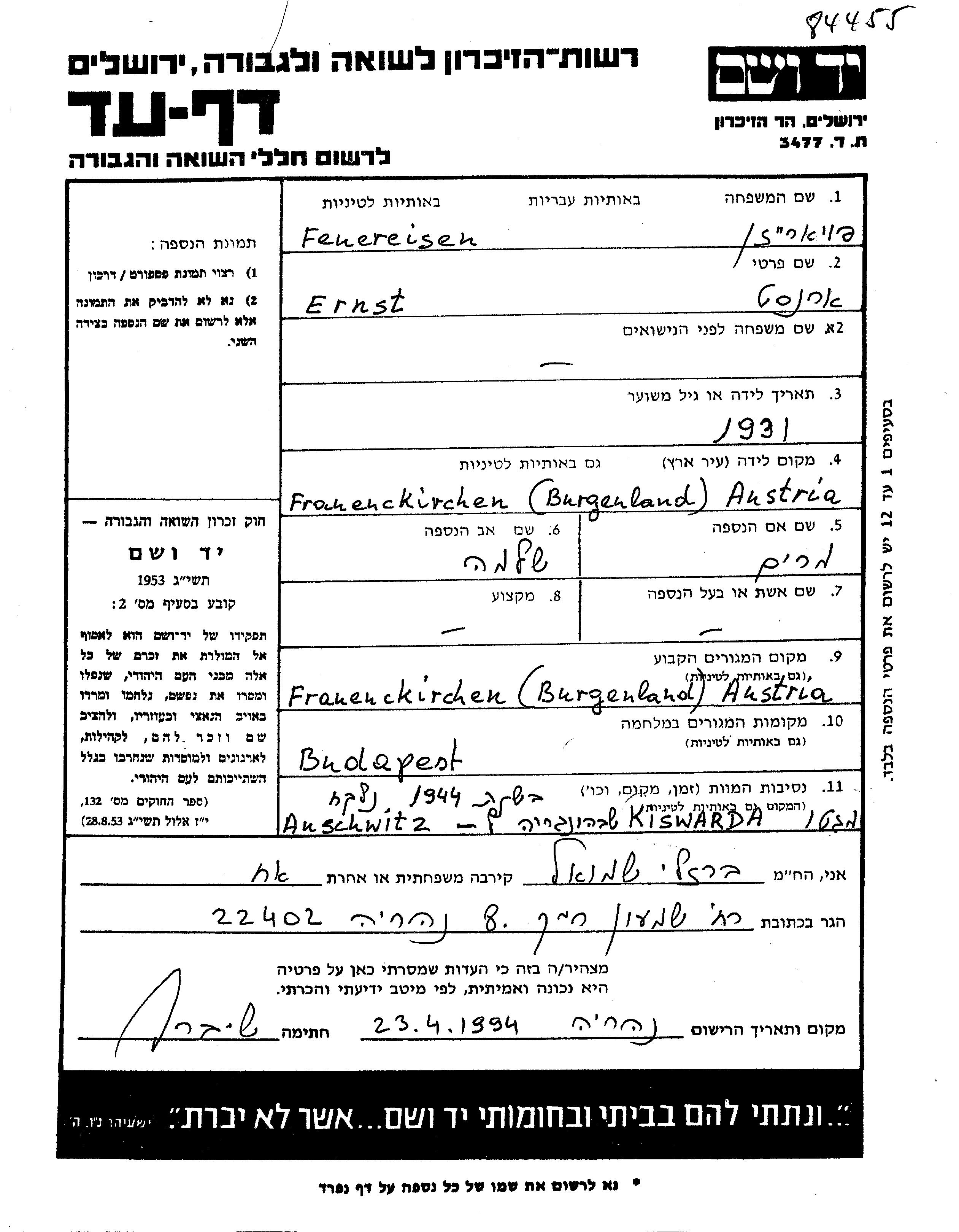 Ernst Shimshon Eliezer wurde in der Schoah ermordet. Todesort: Auschwitz, Polen im Jahr 1944.