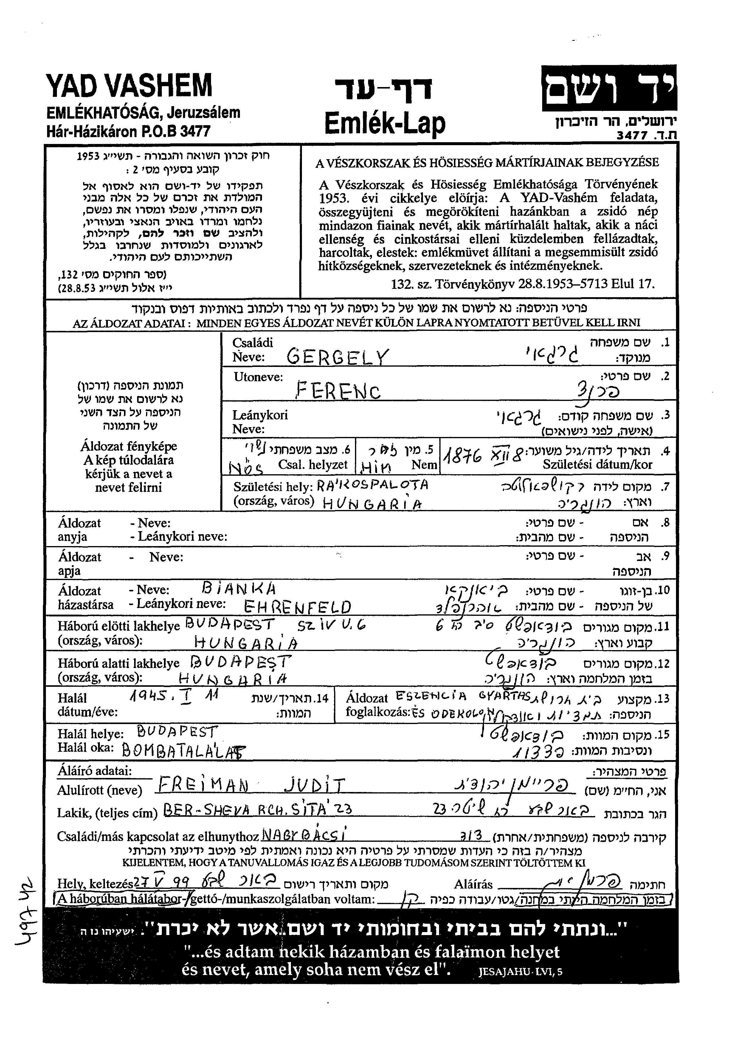 Ferentz wurde in der Schoah ermordet. Todesort: Budapest, Ungarn im Jahr 11/01/1945.