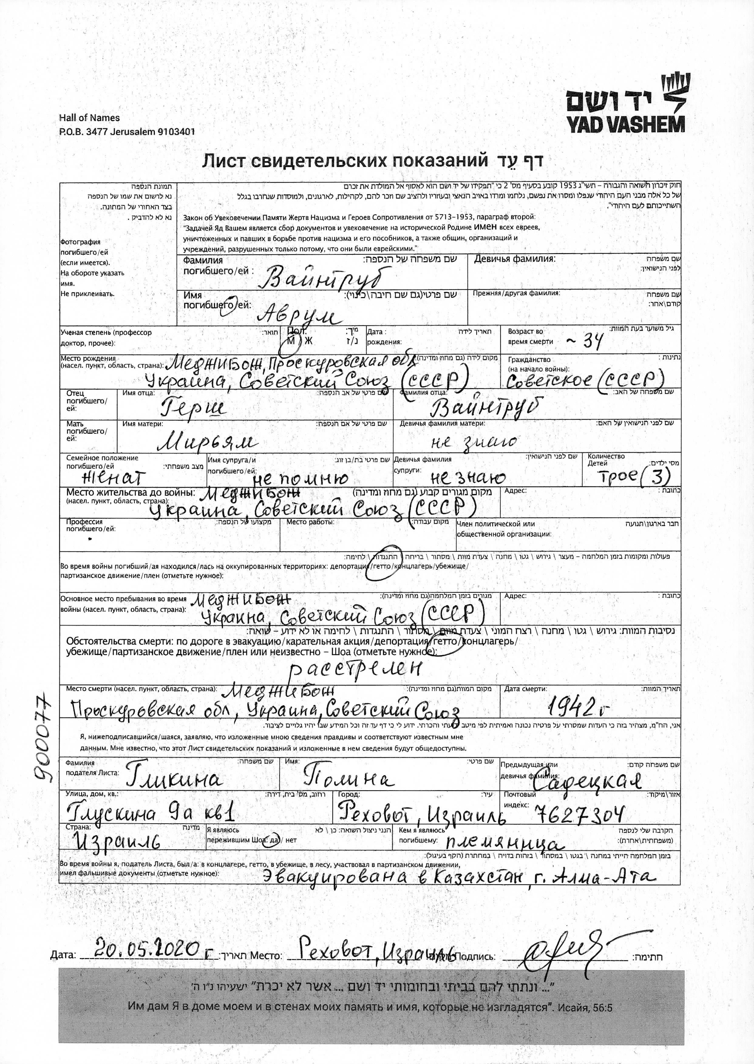Vayntrub Avrum 1908 Medzhibozh, Ukraine (UdSSR) Gedenkblatt