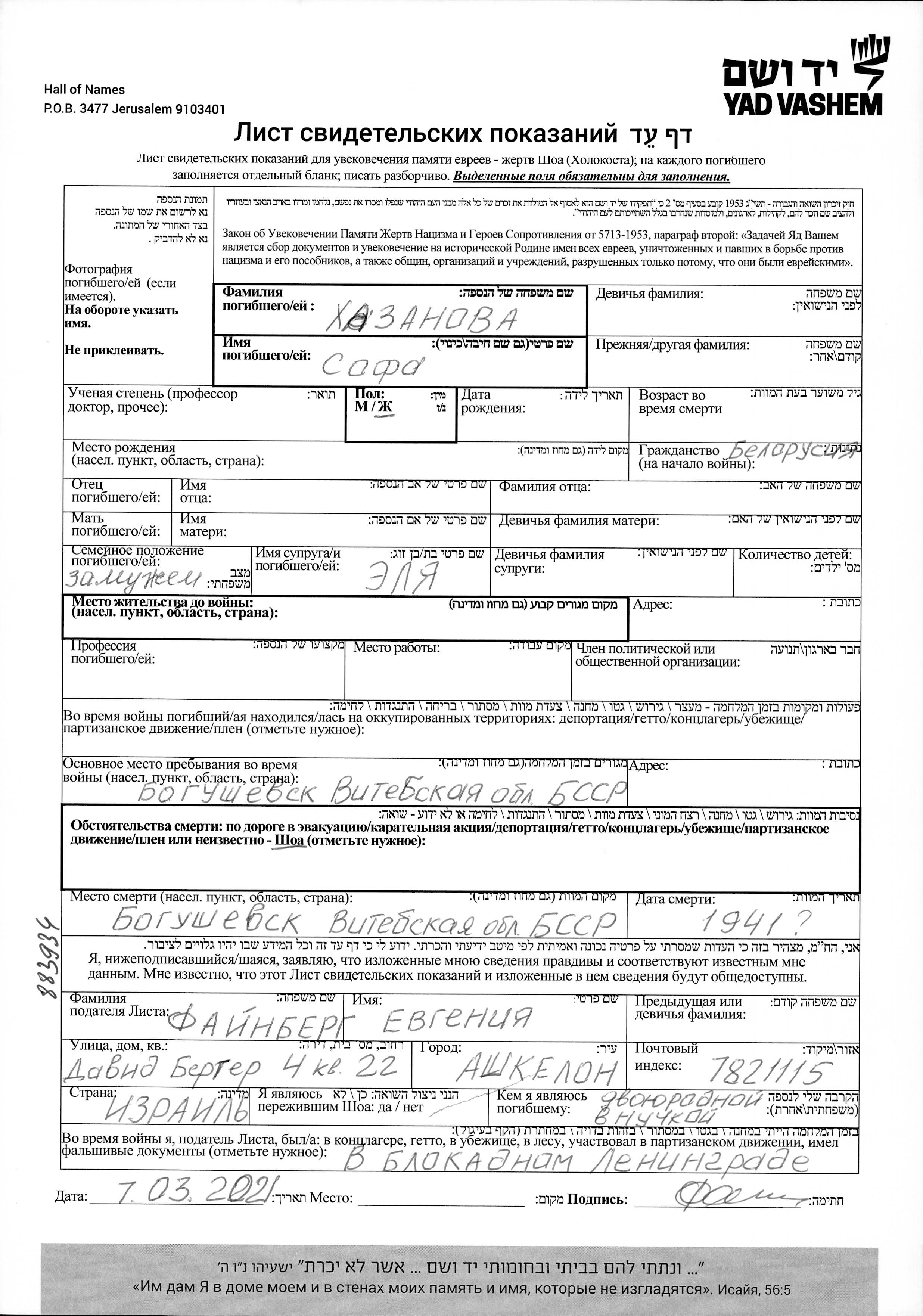 Sofa Khazanova. Sie war mit Elya Verheiratet. Vor dem Zweiten Weltkrieg lebte sie in Weißrussland (UdSSR). Während des Krieges war sie in Bogushevsk, Weißrussland (UdSSR).