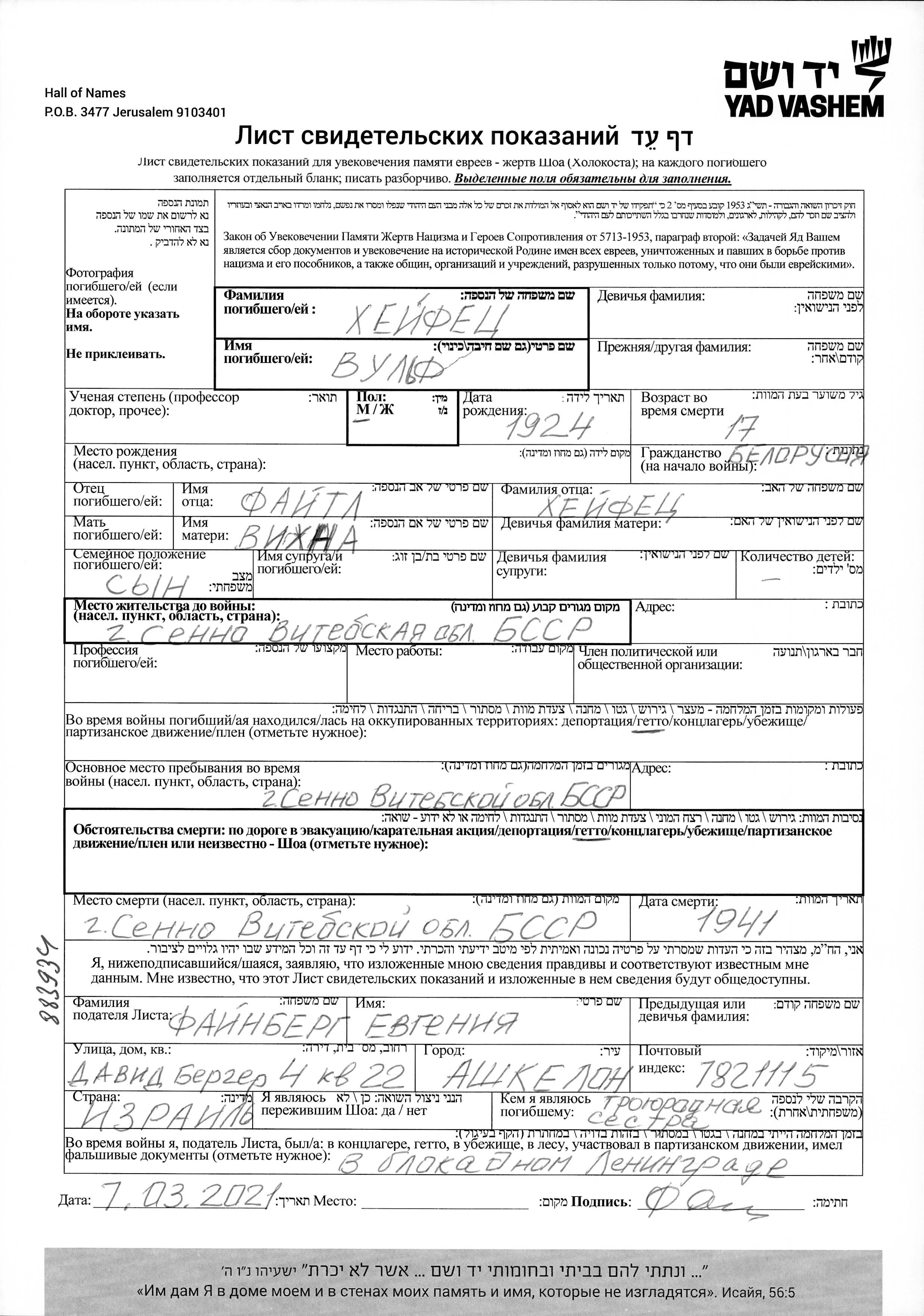 Vulf Kheyfetz wurde im Jahr 1924 geboren. Er war der Sohn von Faytl und Vikhna. Er war Jugendliche/-r. Vor dem Zweiten Weltkrieg lebte er in Senno, Weißrussland (UdSSR). Während des Krieges war er in Senno, Weißrussland (UdSSR).