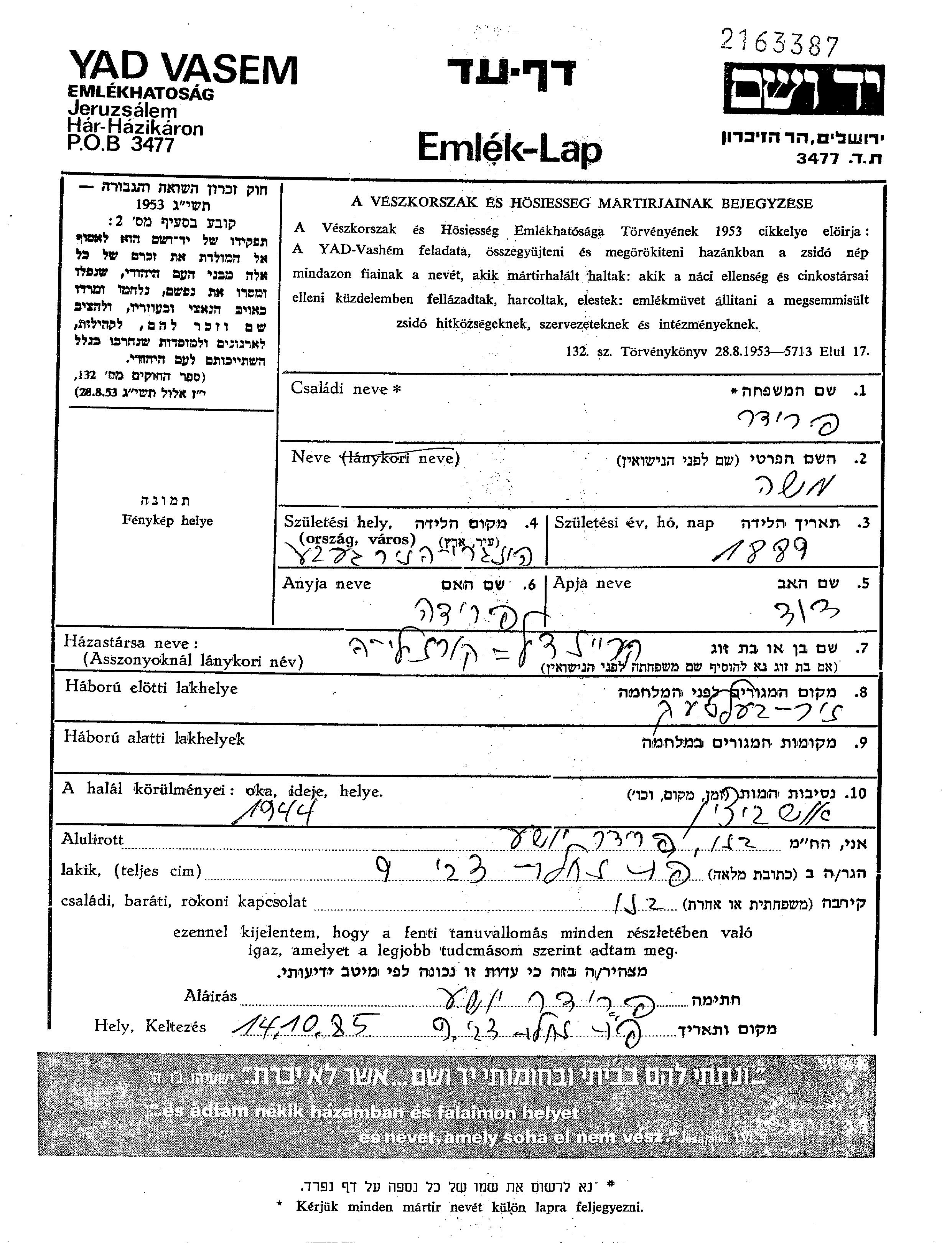 Moshe Frider wurde im Jahr 1889 in Gebe, Ungarn geboren. Er war Kaufmann/-frau. Vor dem Zweiten Weltkrieg lebte er in Nyirbeltek, Ungarn.