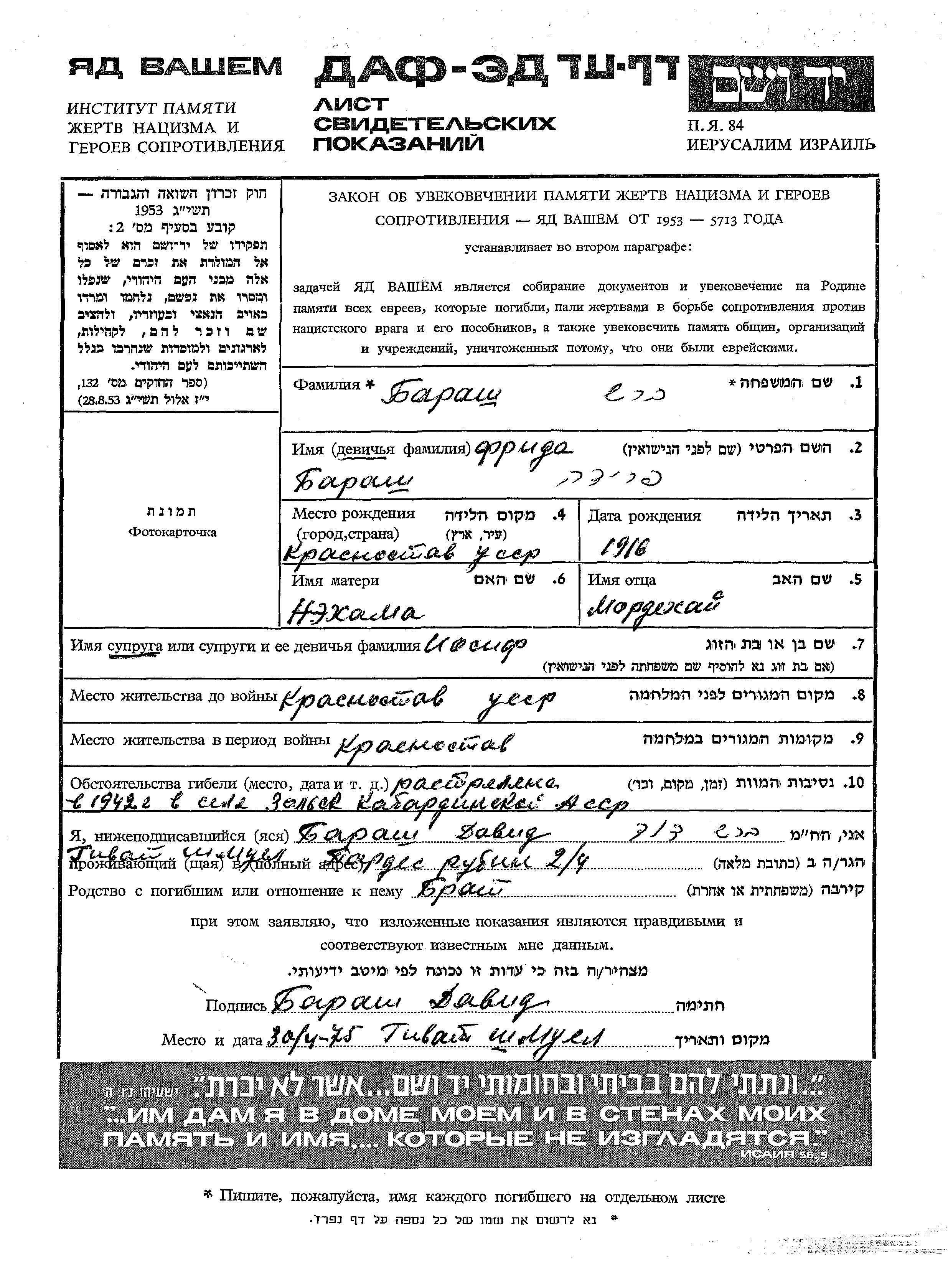 Frida Name unbekannt, geb. Barash wurde im Jahr 1916 in Krasnostav, Ukraine (UdSSR) geboren. Sie war die Tochter von Mordekhai und Nekhama. Sie war mit Iosif Verheiratet. Vor dem Zweiten Weltkrieg lebte sie in Krasnostav, Ukraine (UdSSR). Während des Krieges war sie in Krasnostav, Ukraine (UdSSR).