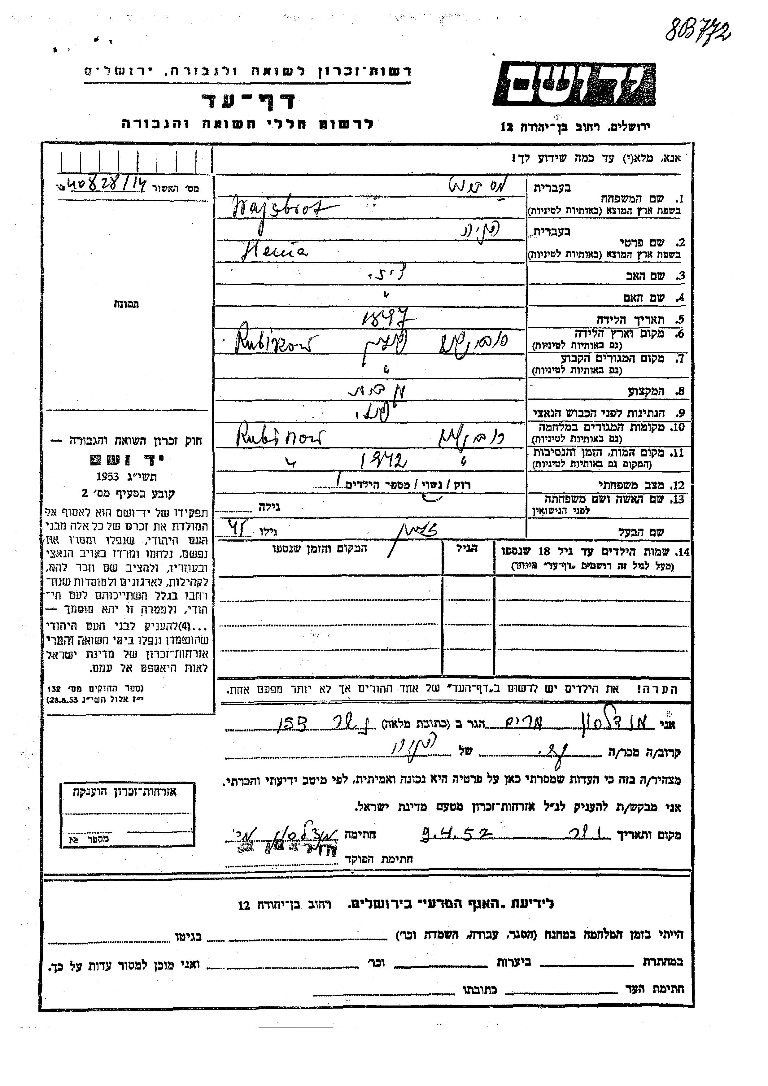 Henia Wajsbrot wurde im Jahr 1897 in Rubieszow, Polen geboren. Sie war Hausfrau und mit Zalman Verheiratet. Vor dem Zweiten Weltkrieg lebte sie in Rubieszow, Polen. Während des Krieges war sie in Rubieszow, Polen.