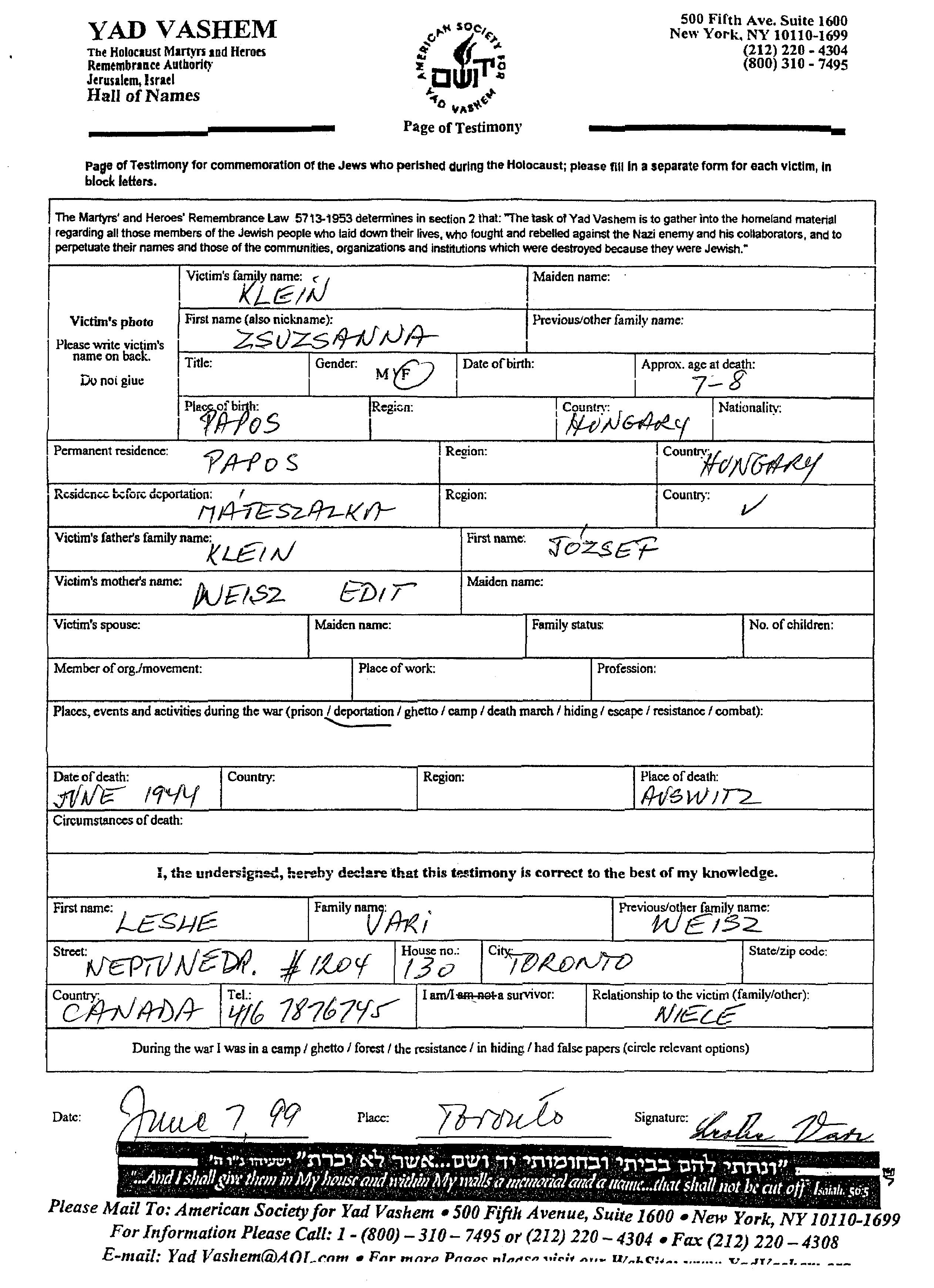 Zsuzsanna Klein wurde in Papos, Ungarn geboren. Vor dem Zweiten Weltkrieg lebte sie in Papos, Ungarn.
