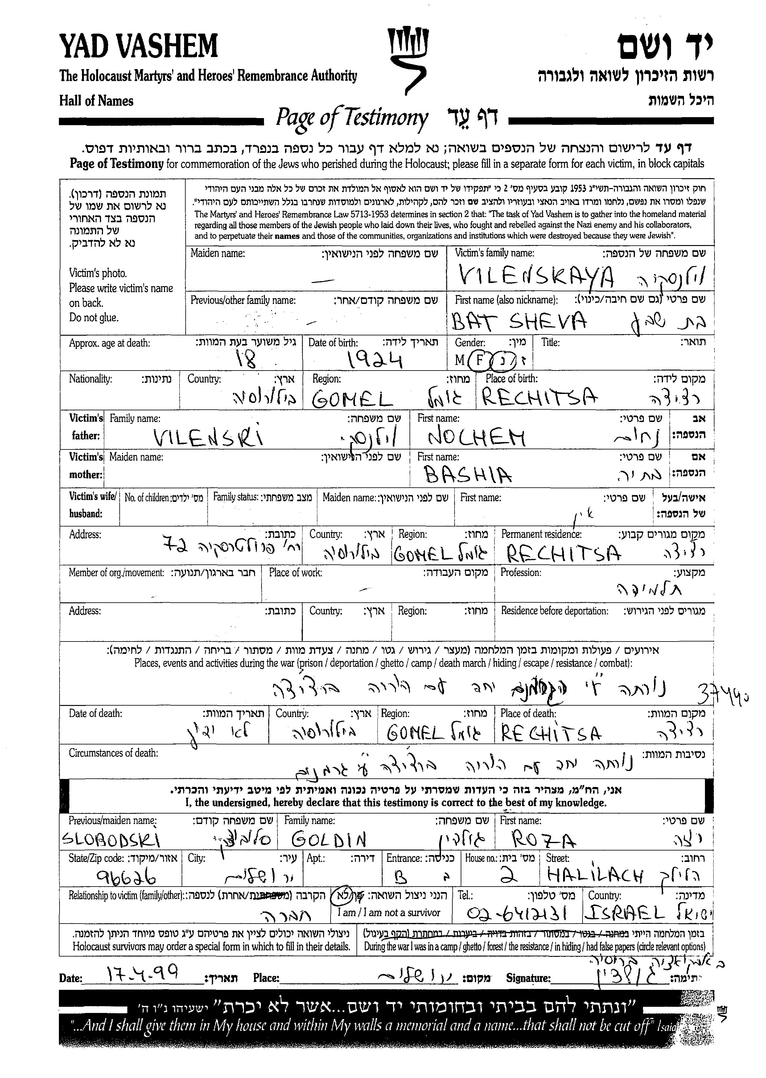 Bat Sheva Vilenskaya wurde im Jahr 1924 in Rechitsa, Weißrussland (UdSSR) geboren. Sie war Hausfrau. Vor dem Zweiten Weltkrieg lebte sie in Rechitsa, Weißrussland (UdSSR).
