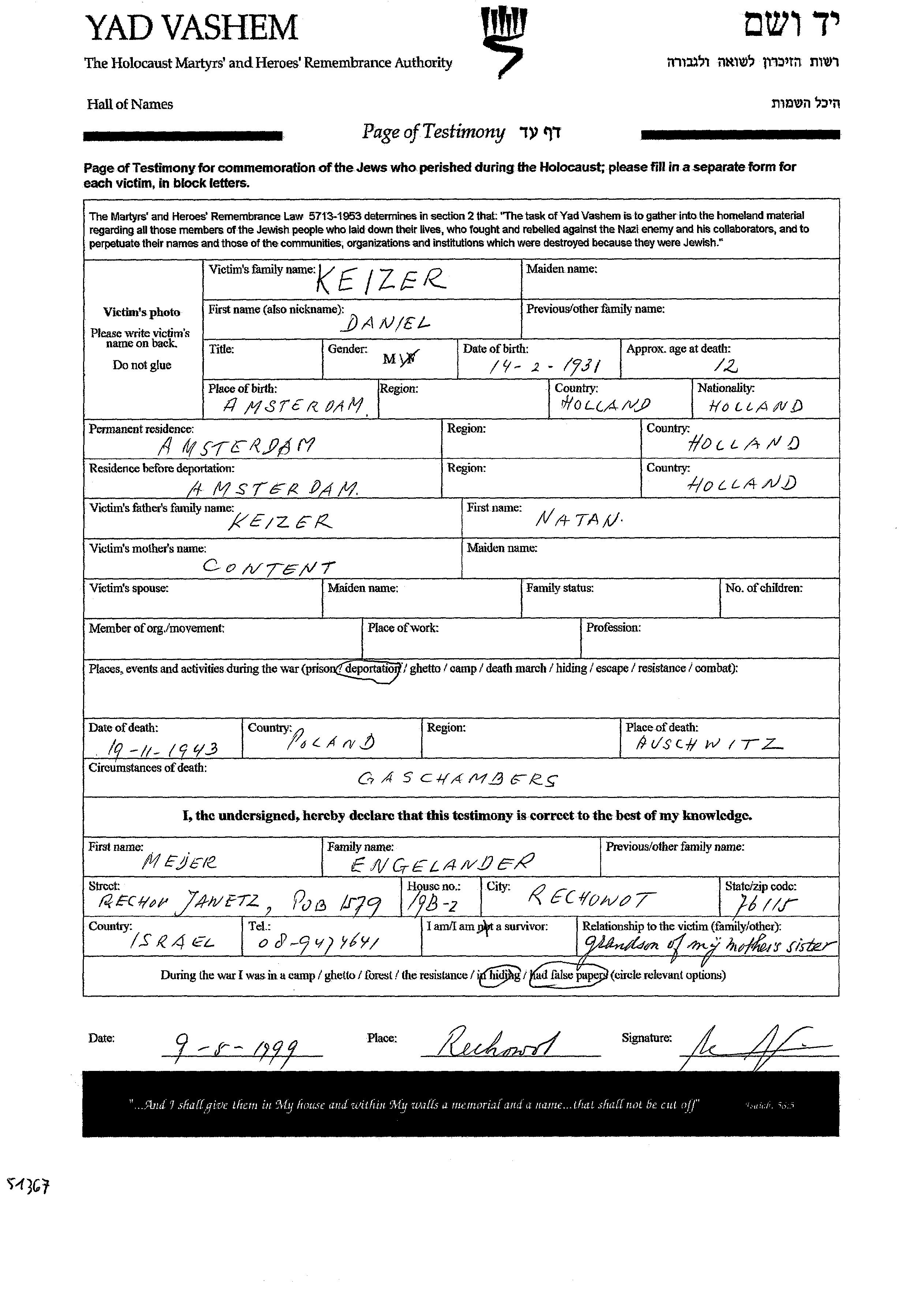 Daniel wurde in der Schoah ermordet. Todesort: Auschwitz, Polen im Jahr 19/11/1943.