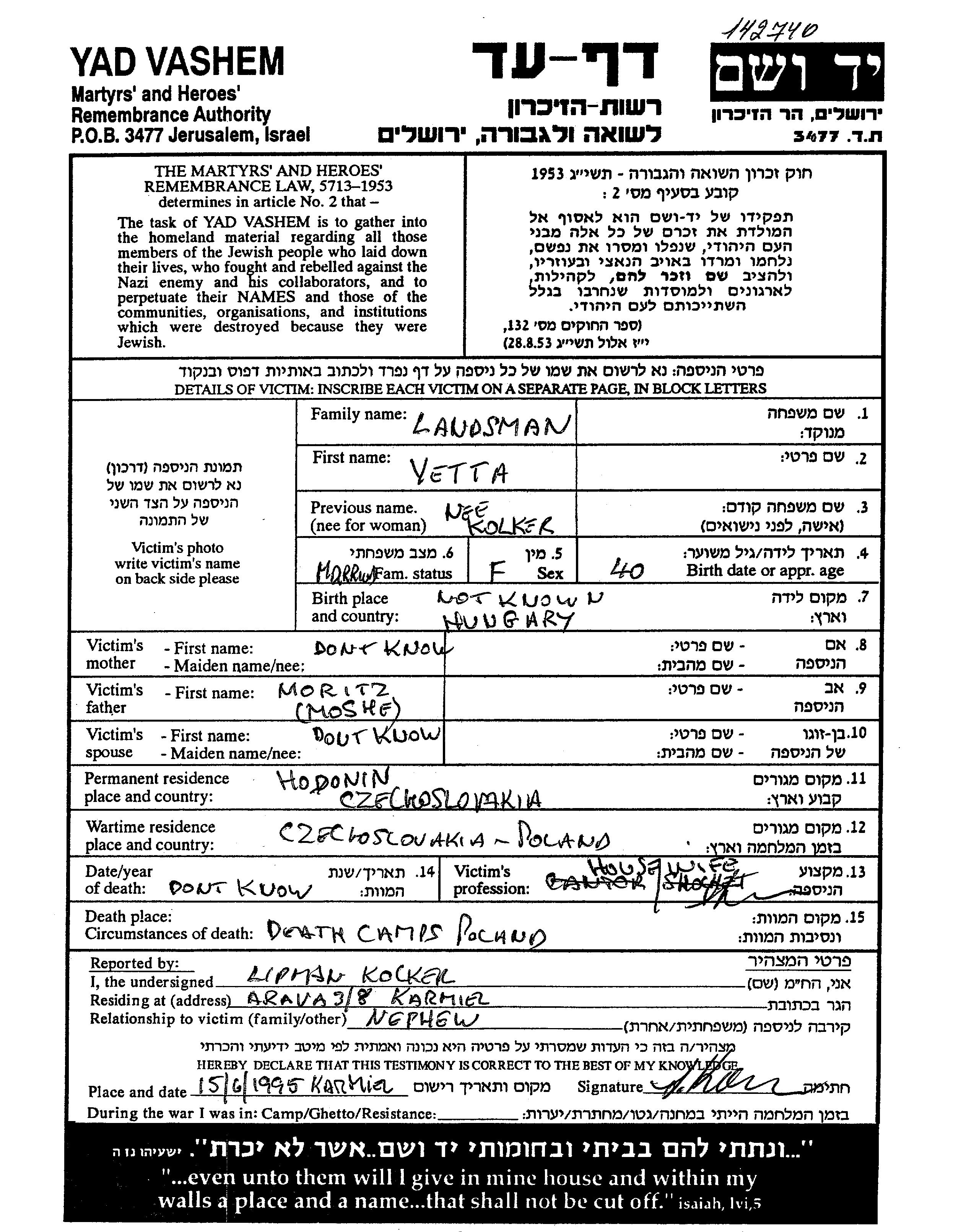 Yetta Yeta Landsman, geb. Kolker wurde in Ungarn geboren. Sie war die Tochter von Moritz Moshe. Sie war Hausfrau und Verheiratet. Vor dem Zweiten Weltkrieg lebte sie in Hodonin, Tschechoslowakei. Während des Krieges war sie in Tschechoslowakei.