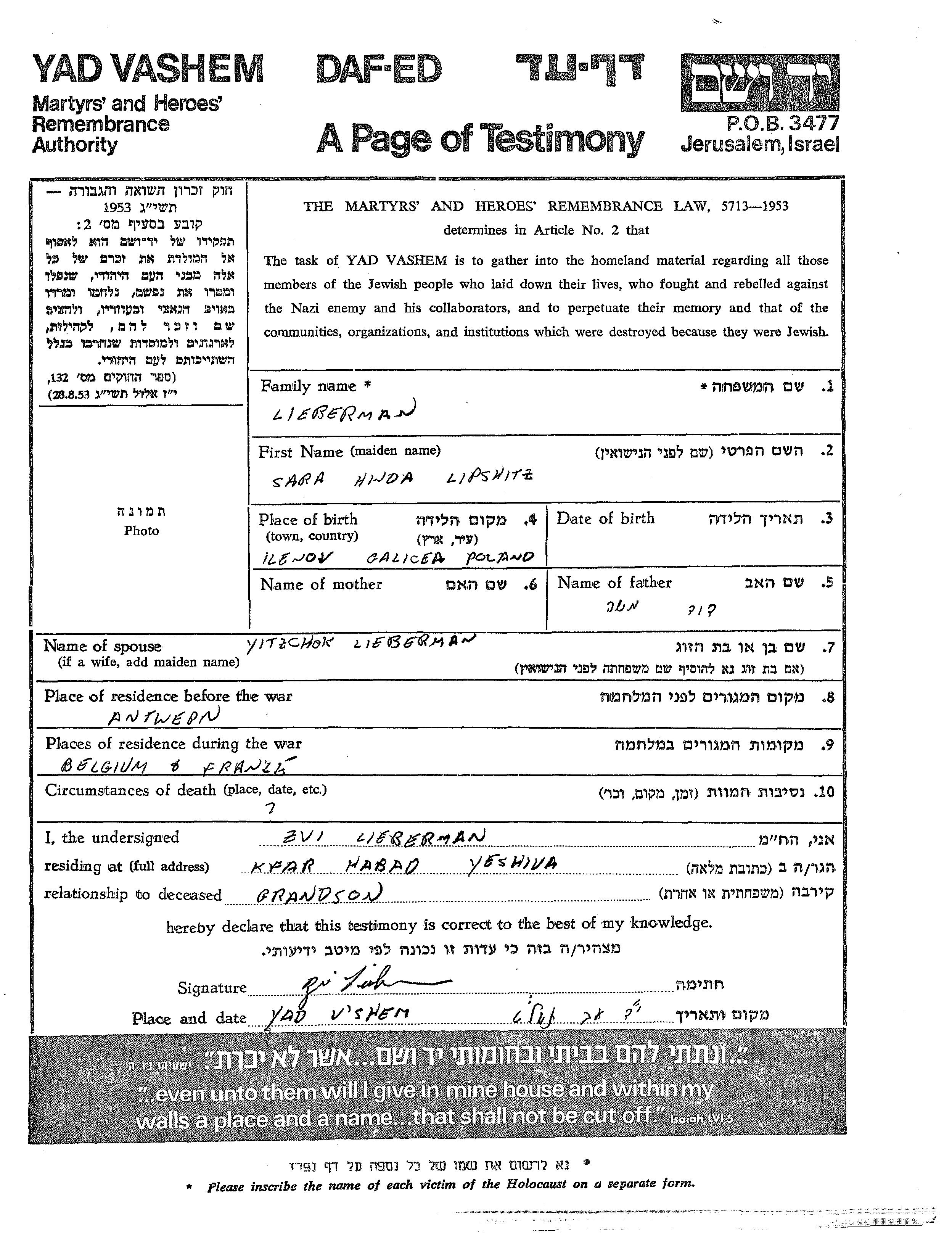 Lieberman | Sara Hinda | Antwerpen, Belgien | Gedenkblatt | |