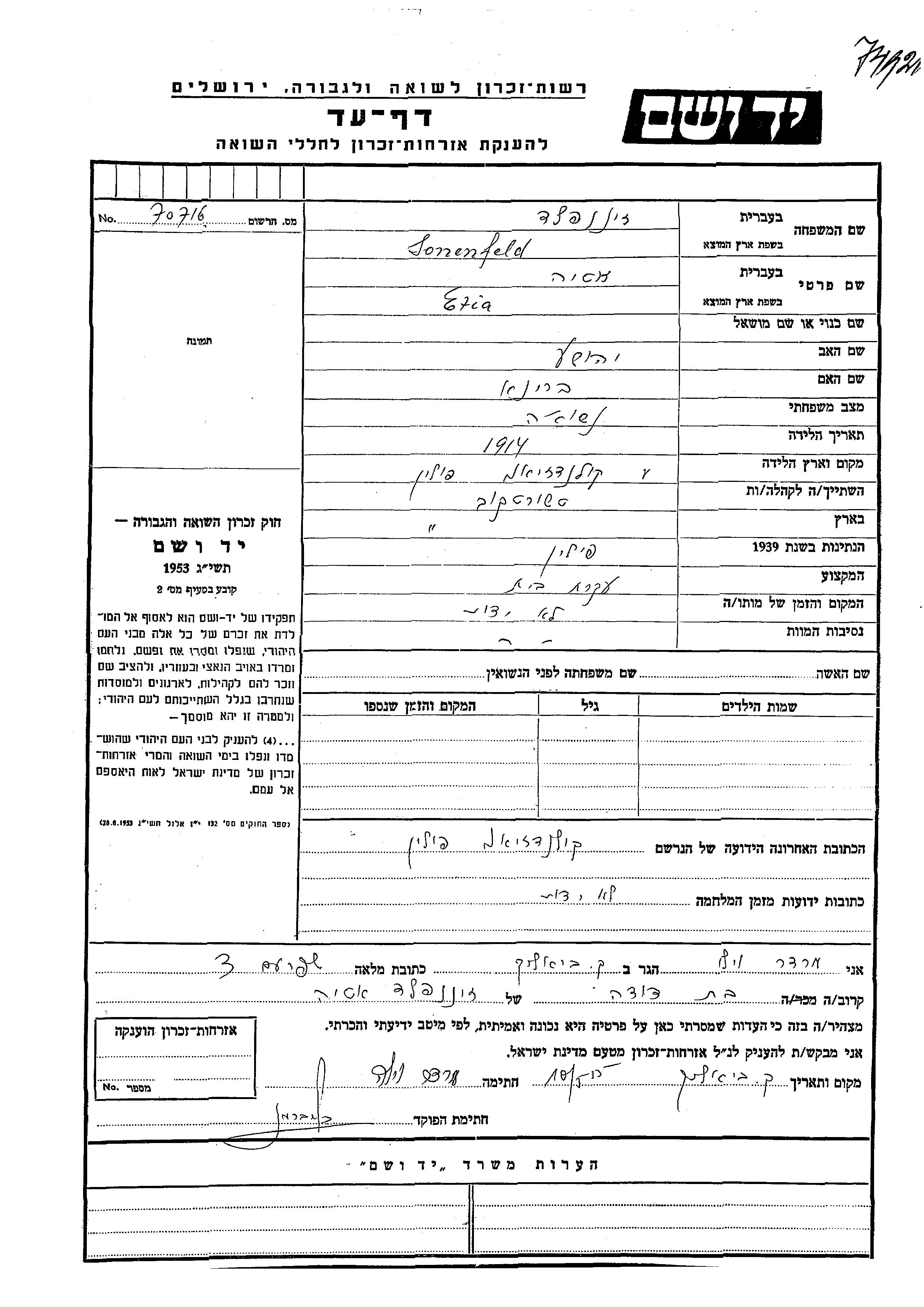 Etia Sonnenfeld wurde im Jahr 1914 geboren. Sie war die Tochter von Yehoshua und Breina. Sie war Hausfrau.