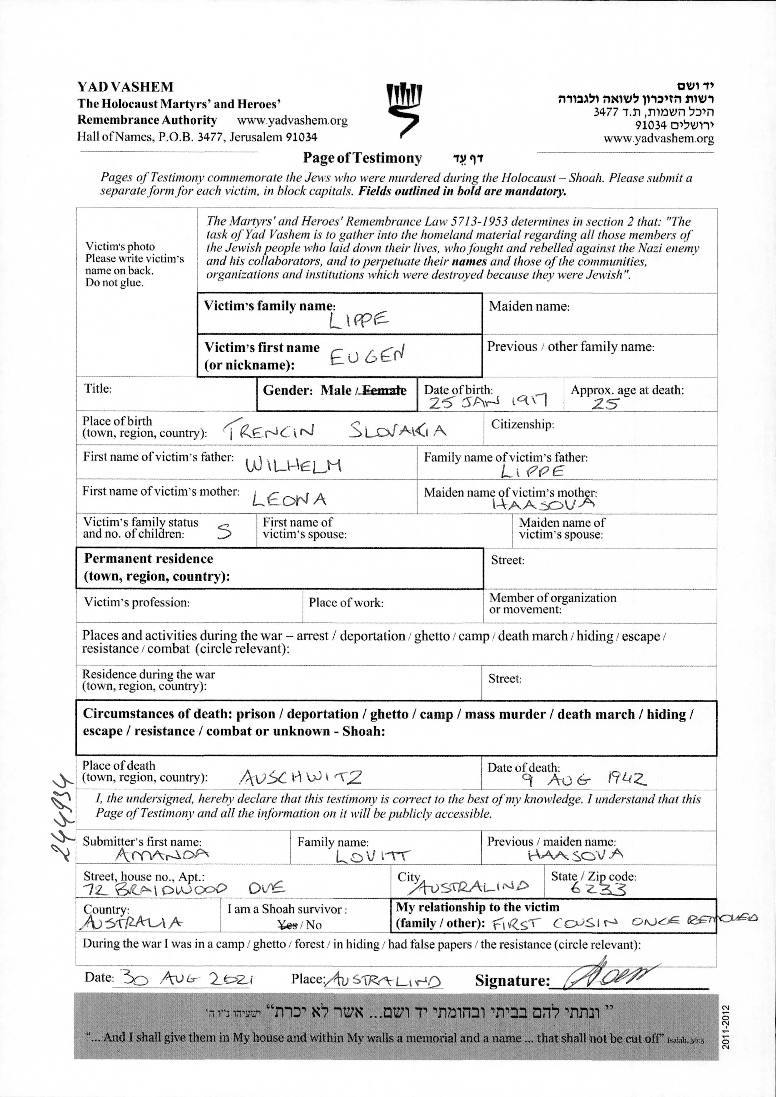 Eugen Lippe wurde im Jahr 1917 in Trencin, Tschechoslowakei geboren. Er war der Sohn von Wilhelm und Leona, geb. Haas. Er war Ledig. Während des Krieges war er in Auschwitz, Polen.