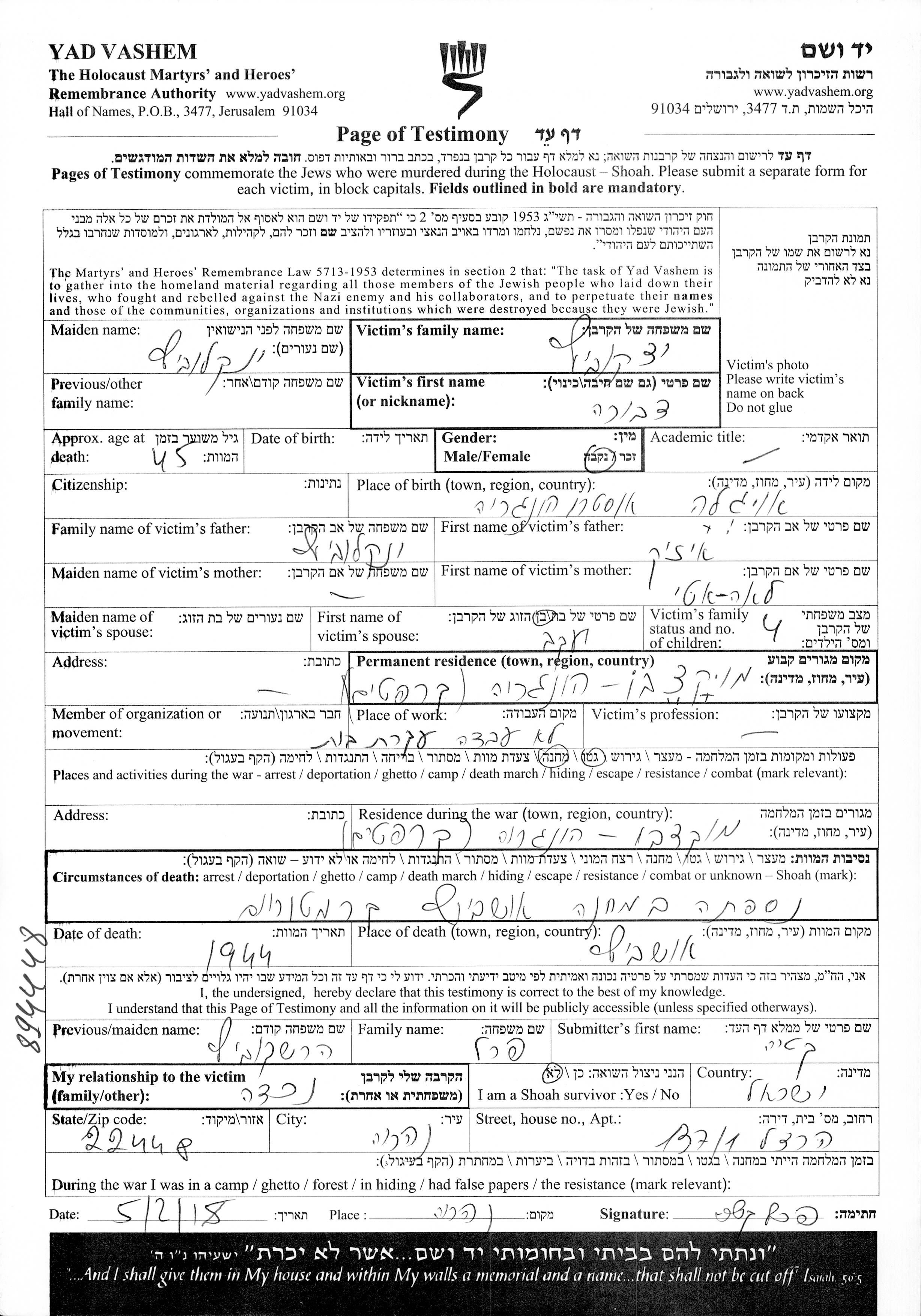 Dvora Itzkovitz, geb. Iankelovitz wurde in Ugla, Tschechoslowakei geboren. Sie war die Tochter von Aizik und Lea Ester. Sie war Hausfrau und mit Yaakov Verheiratet. Vor dem Zweiten Weltkrieg lebte sie in Mukacevo, Tschechoslowakei. Während des Krieges war sie in Auschwitz, Polen.