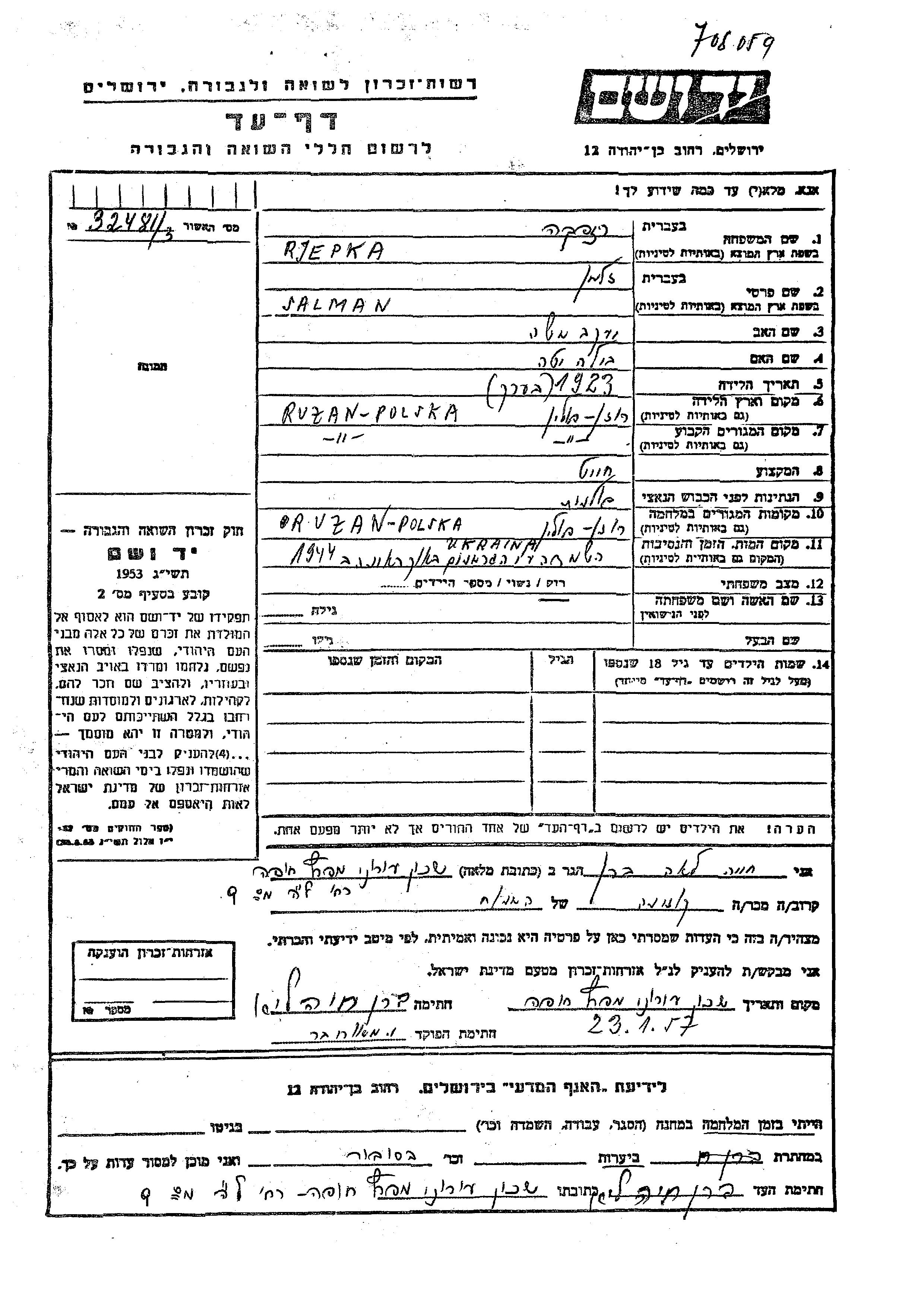 Salman Rjepka wurde im Jahr 1923 in Ruzan, Polen geboren. Er war der Sohn von Yaakov Moshe und Bila Yeta. Er war Schneider und Ledig. Vor dem Zweiten Weltkrieg lebte er in Ruzan, Polen. Während des Krieges war er in Ruzan, Polen.