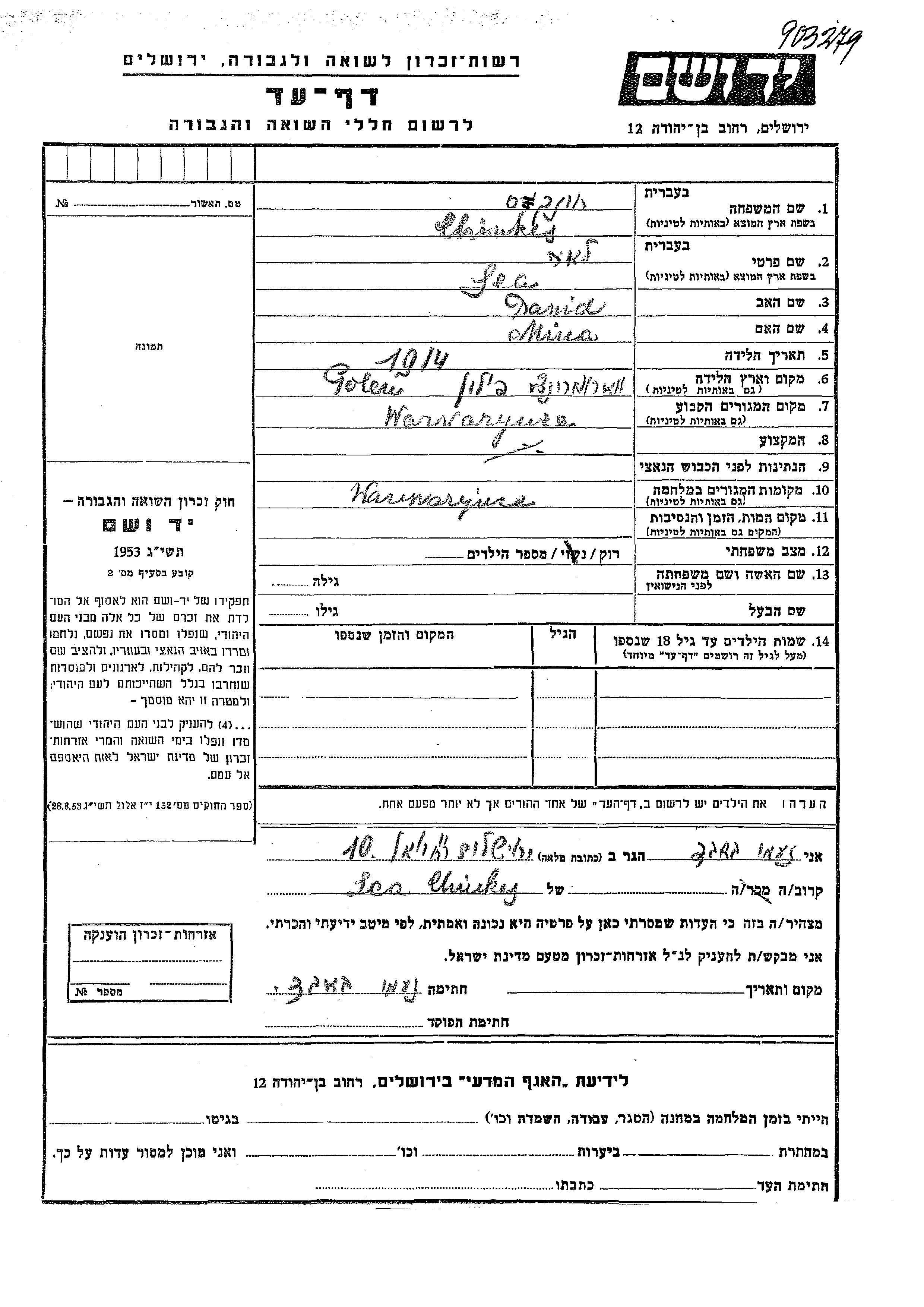 Lea Chinkes wurde im Jahr 1914 in Warwarynce, Polen geboren. Sie war die Tochter von David und Mina. Sie war Ledig. Vor dem Zweiten Weltkrieg lebte sie in Warwarynce, Polen. Während des Krieges war sie in Warwarynce, Polen.