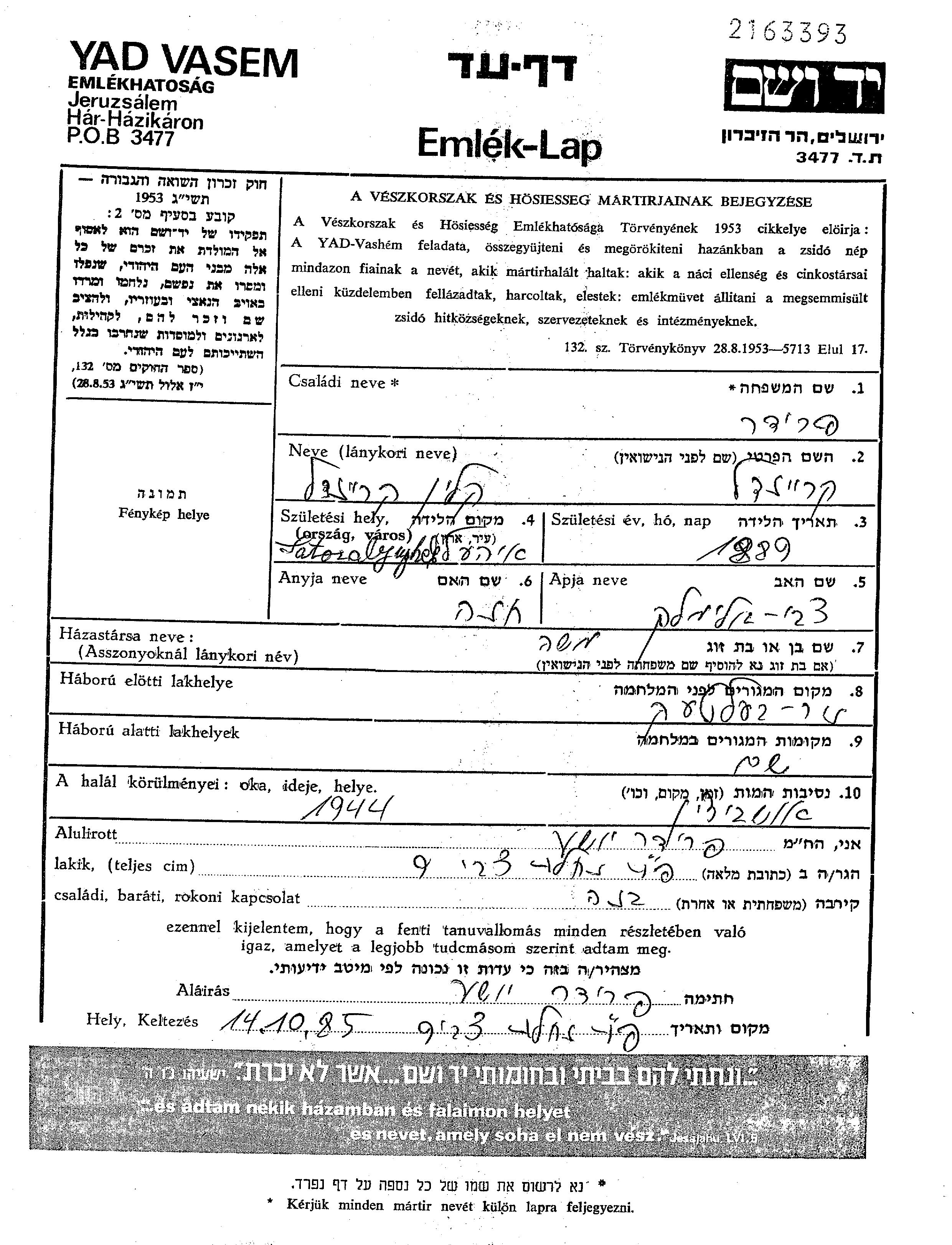 Kreindl Kornelia Frieder, geb. Klein wurde im Jahr 1889 in Satoraljaujhely, Ungarn geboren. Sie war Hausfrau. Vor dem Zweiten Weltkrieg lebte sie in Nyirbeltek, Ungarn.
