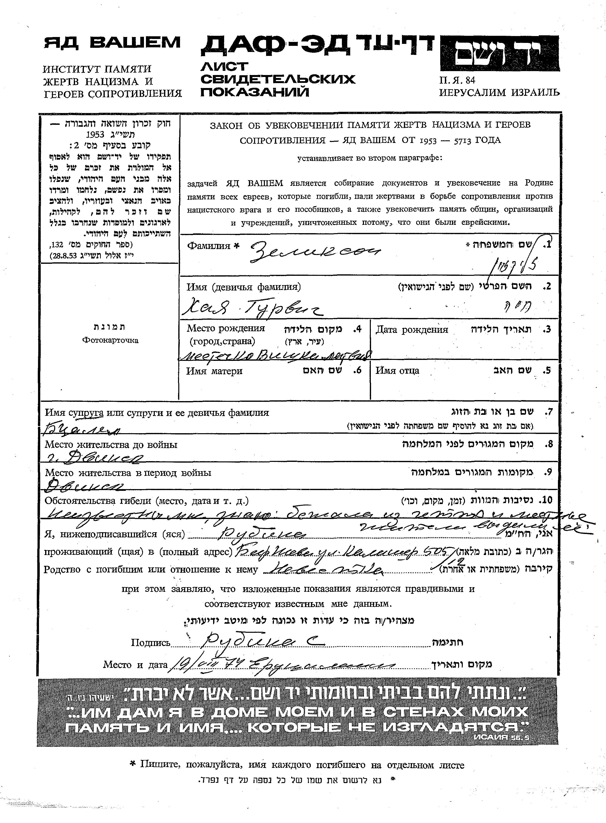 Khaia Zelikson, geb. Gurvich wurde in Vishki, Polen geboren. Sie war mit Btzalel Verheiratet. Vor dem Zweiten Weltkrieg lebte sie in Dvinsk, Lettland. Während des Krieges war sie in Dvinsk, Lettland.