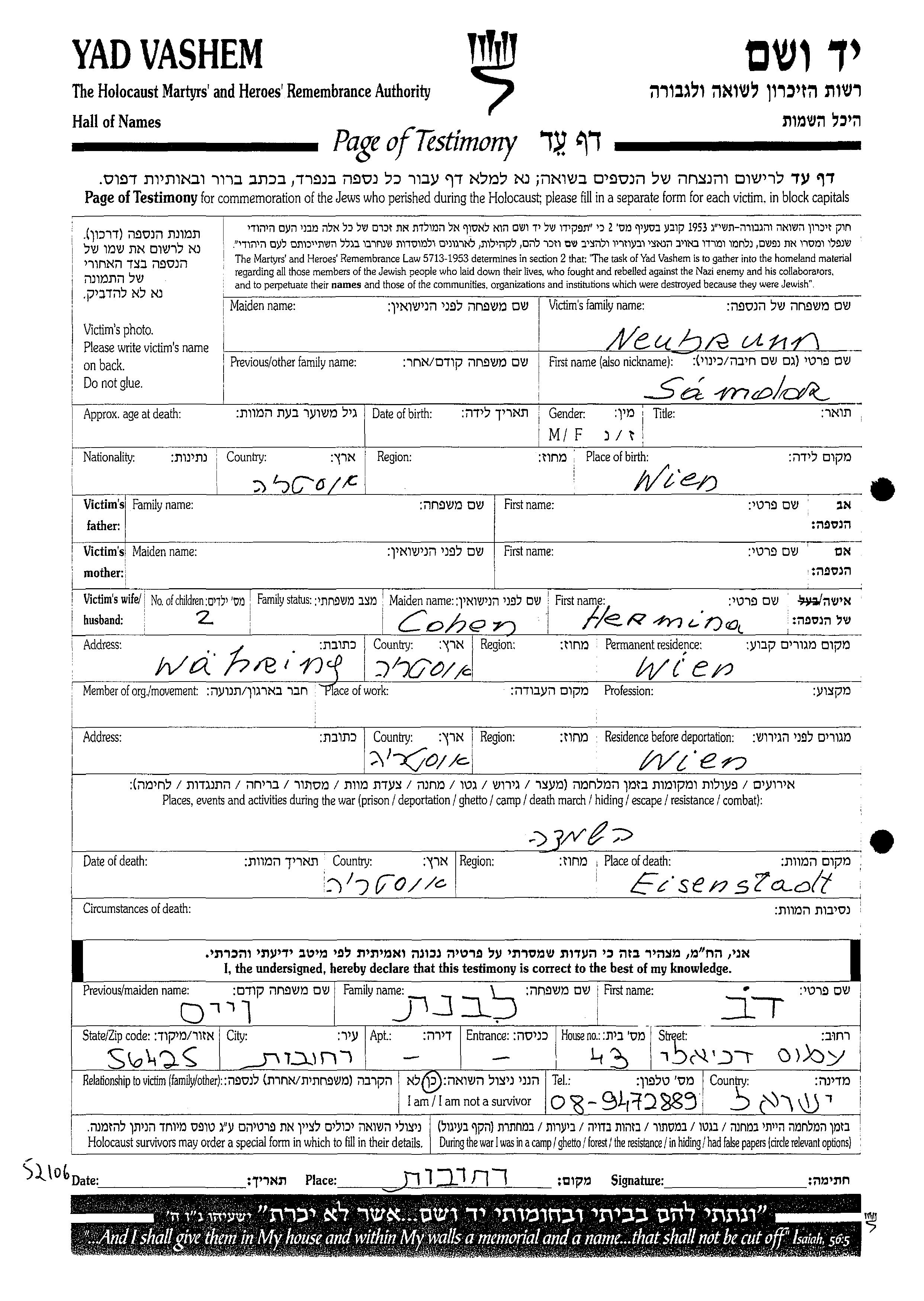 Neubrunn Sandor 1898 Wien, Österreich Liste von ermordeten oesterreichischen Juden
