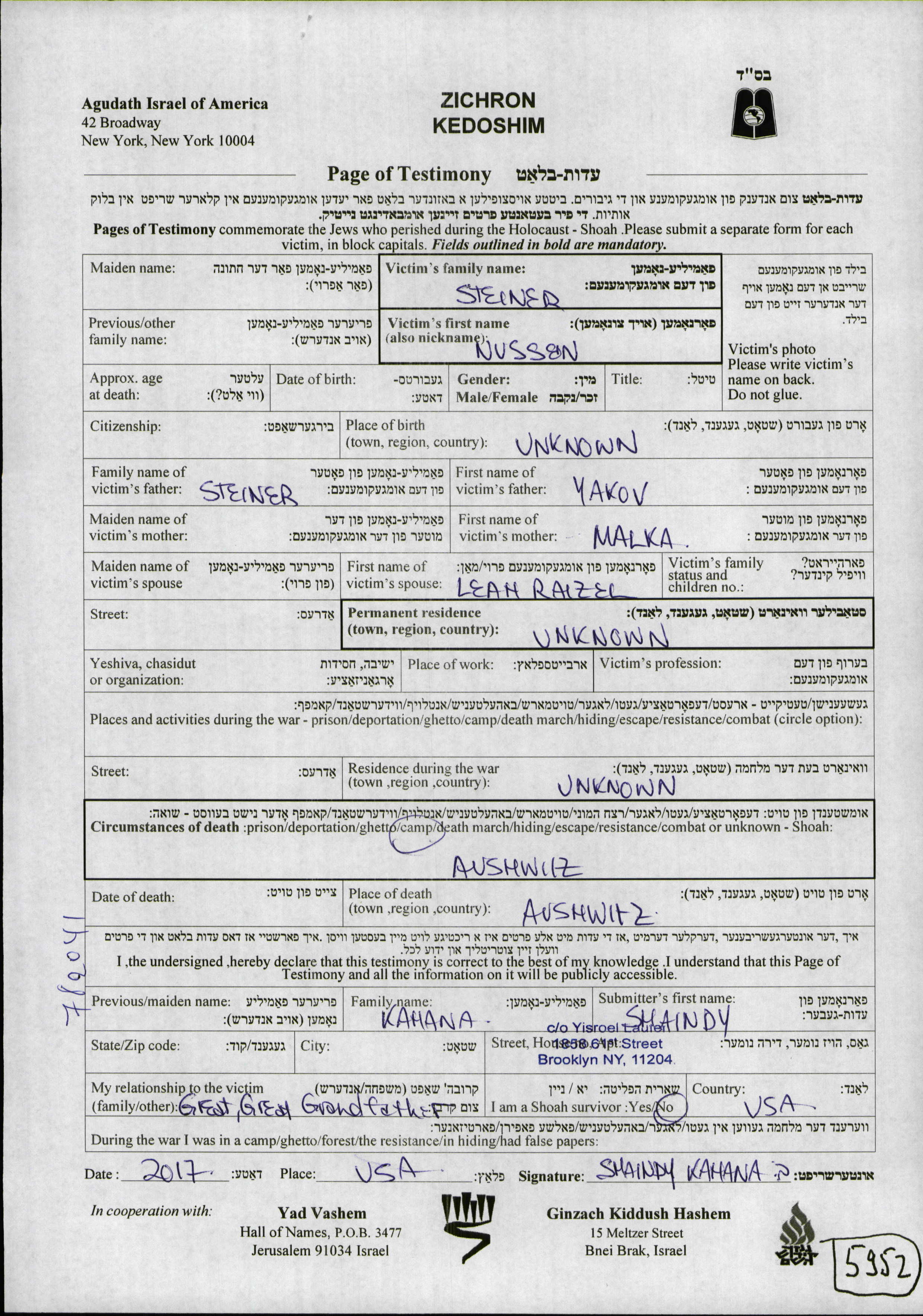 Nussen Steiner wurde in unbekannter Ort geboren. Vor dem Zweiten Weltkrieg lebte er in Gyongyos, Ungarn.