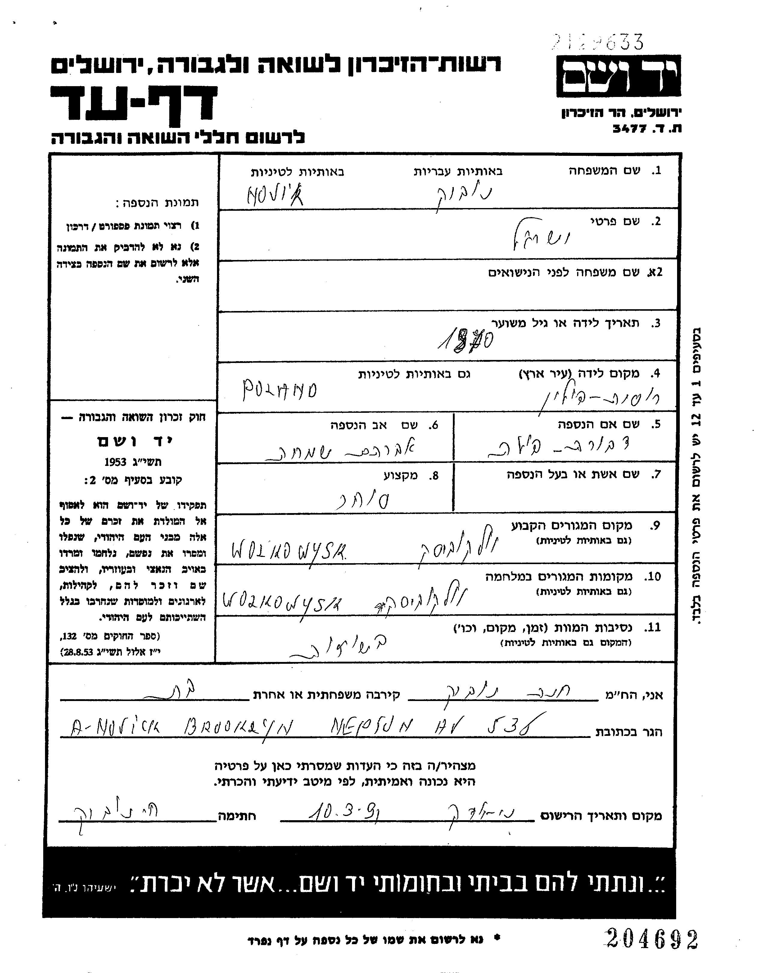 Novik | Israel | Wolkowysk, Polen | Gedenkblatt | |