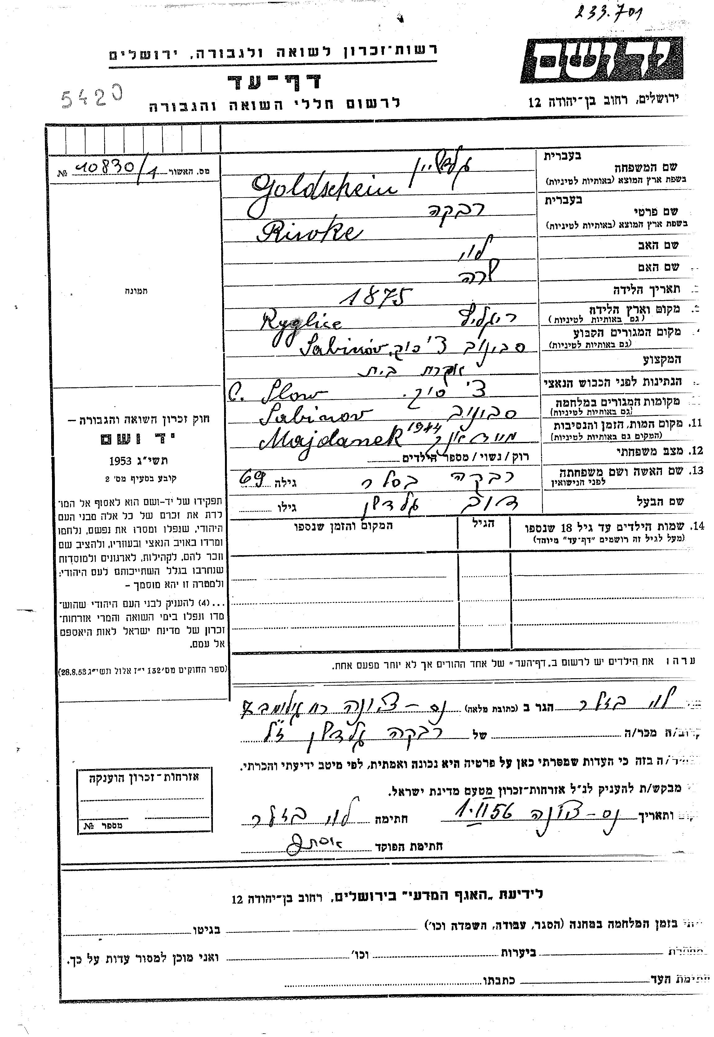 Rivke Goldschein, geb. Basler wurde im Jahr 1875 in Ryglice, Polen geboren. Sie war die Tochter von Levi und Sara. Sie war Hausfrau und mit Dov Verheiratet. Vor dem Zweiten Weltkrieg lebte sie in Sabinov, Tschechoslowakei. Während des Krieges war sie in Sabinov, Tschechoslowakei.