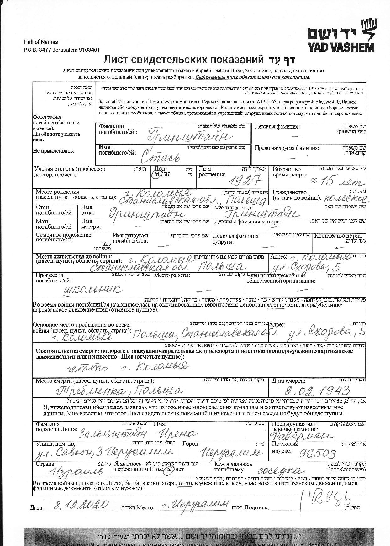 Stas wurde in der Schoah ermordet. Todesort: Treblinka, Polen im Jahr 02/02/1943.
