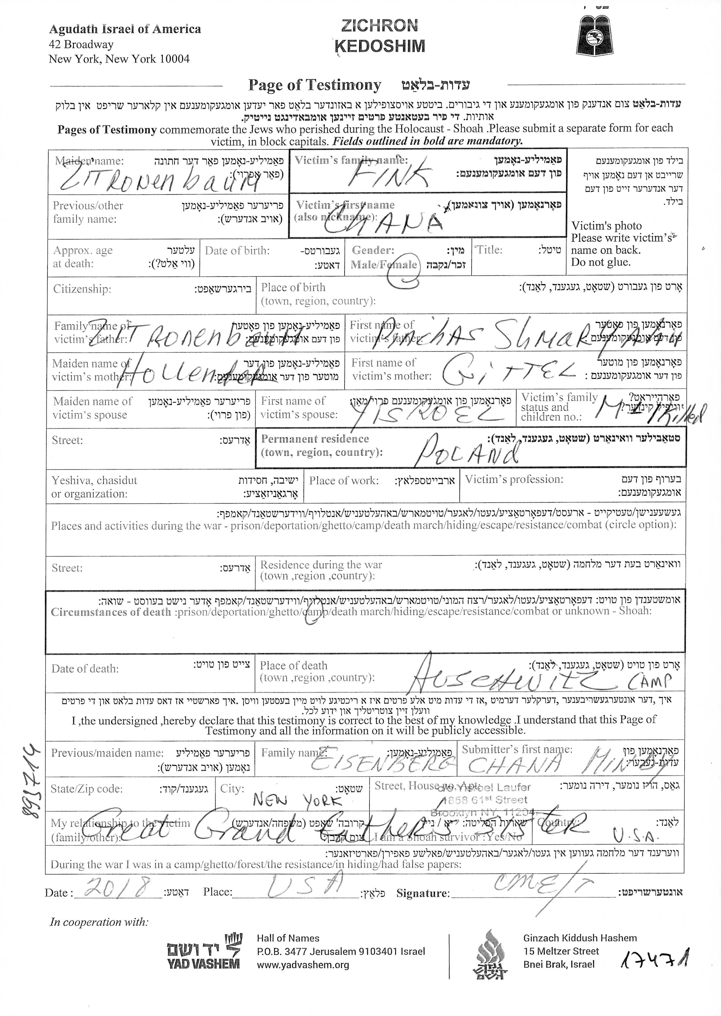 Chana Fink, geb. Zitronenbaum wurde im Jahr 1917 in Krosno, Polen geboren. Vor dem Zweiten Weltkrieg lebte sie in Polen.