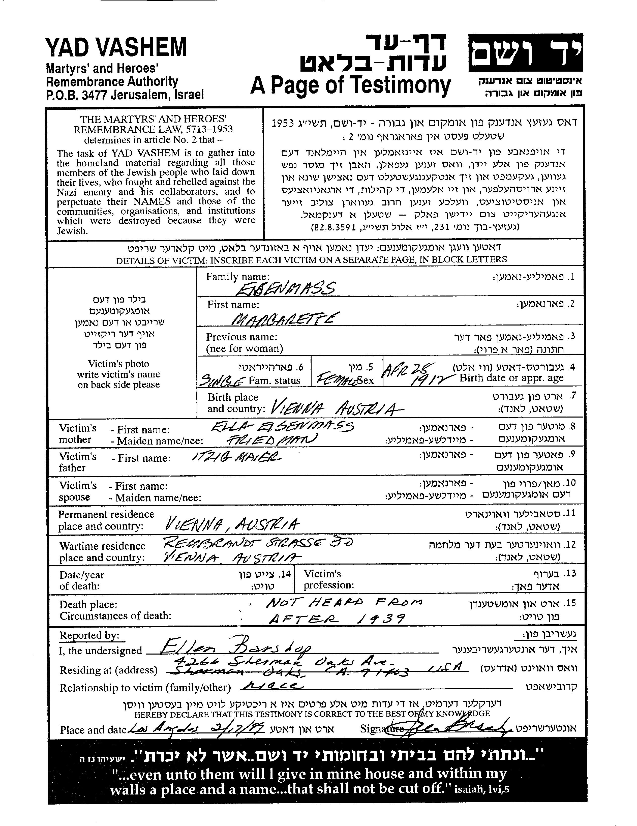 Margarette Eisenmass wurde im Jahr 1917 in Wien, Österreich geboren. Sie war die Tochter von Yitzkhak Maier und Ella. Vor dem Zweiten Weltkrieg lebte sie in Wien, Österreich. Während des Krieges war sie in Wien, Österreich.