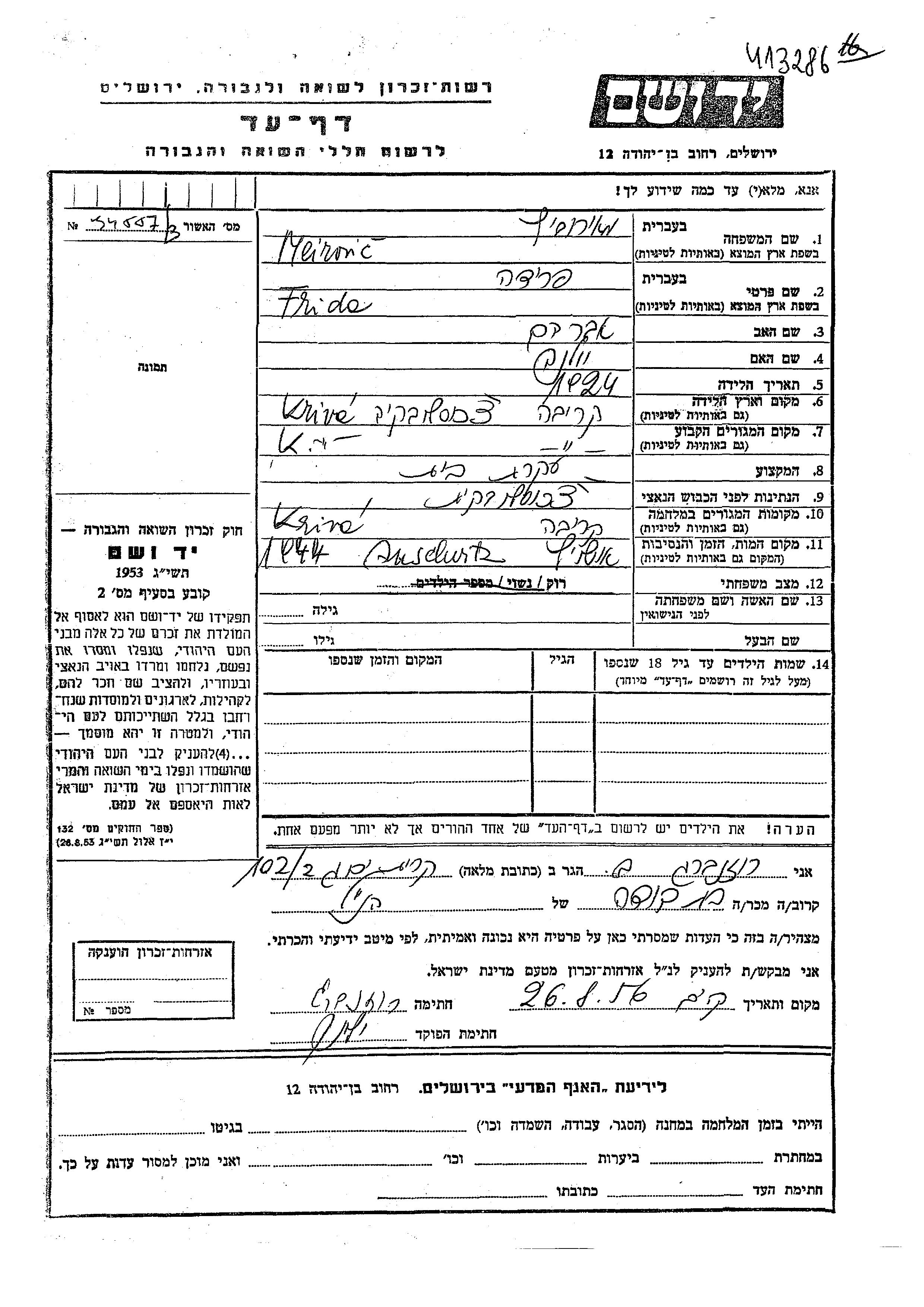Frida Meirovic wurde im Jahr 1924 in Krive, Tschechoslowakei geboren. Sie war die Tochter von Avraham und Iolana. Sie war Hausfrau und Ledig. Vor dem Zweiten Weltkrieg lebte sie in Krive, Tschechoslowakei. Während des Krieges war sie in Krive, Tschechoslowakei.