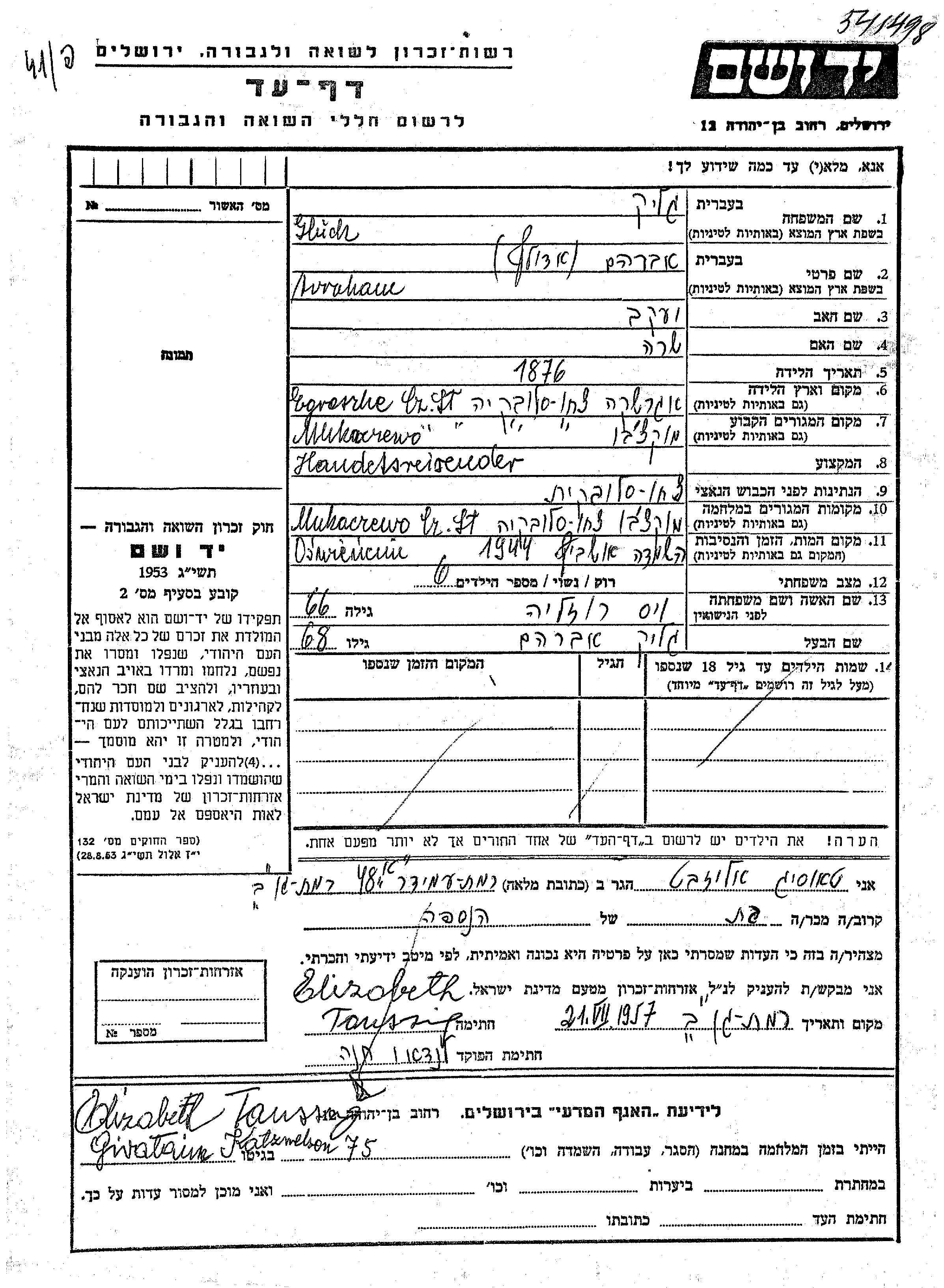 Avraham Adolf Glück wurde im Jahr 1876 in Egreske, Tschechoslowakei geboren. Er war der Sohn von Yaakov und Sara. Er war Vertreter/-in und mit Rozalia, geb. Veis Verheiratet. Vor dem Zweiten Weltkrieg lebte er in Mukaczewo, Tschechoslowakei. Während des Krieges war er in Mukaczewo, Tschechoslowakei.