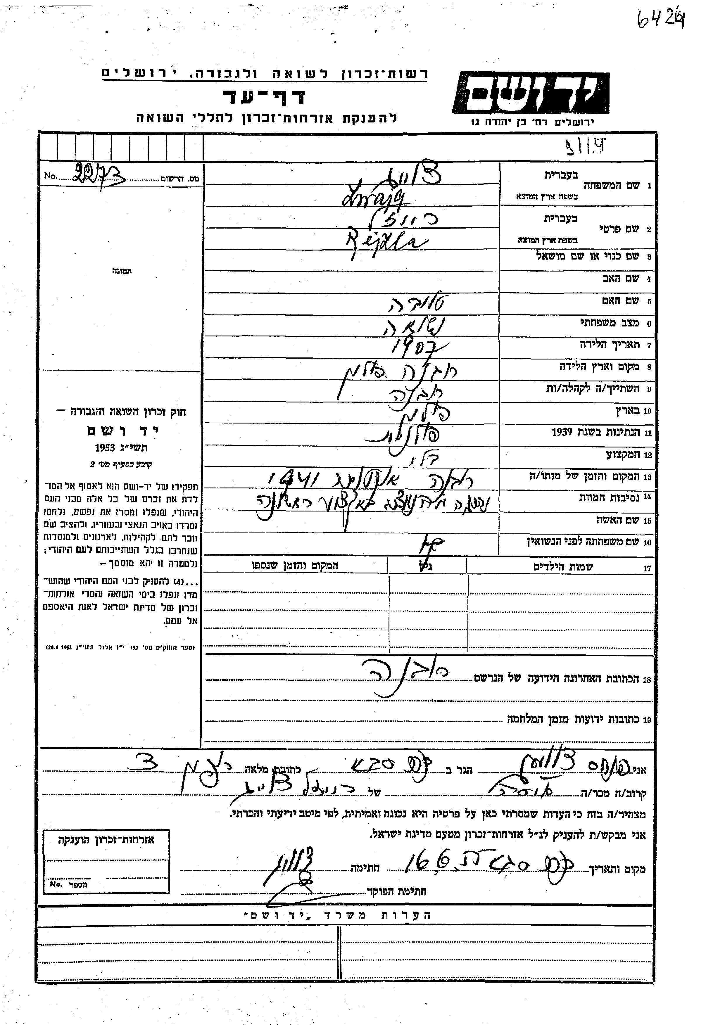 Rejzla wurde in der Schoah ermordet. Todesort: Rowne, Polen im Jahr 1941.