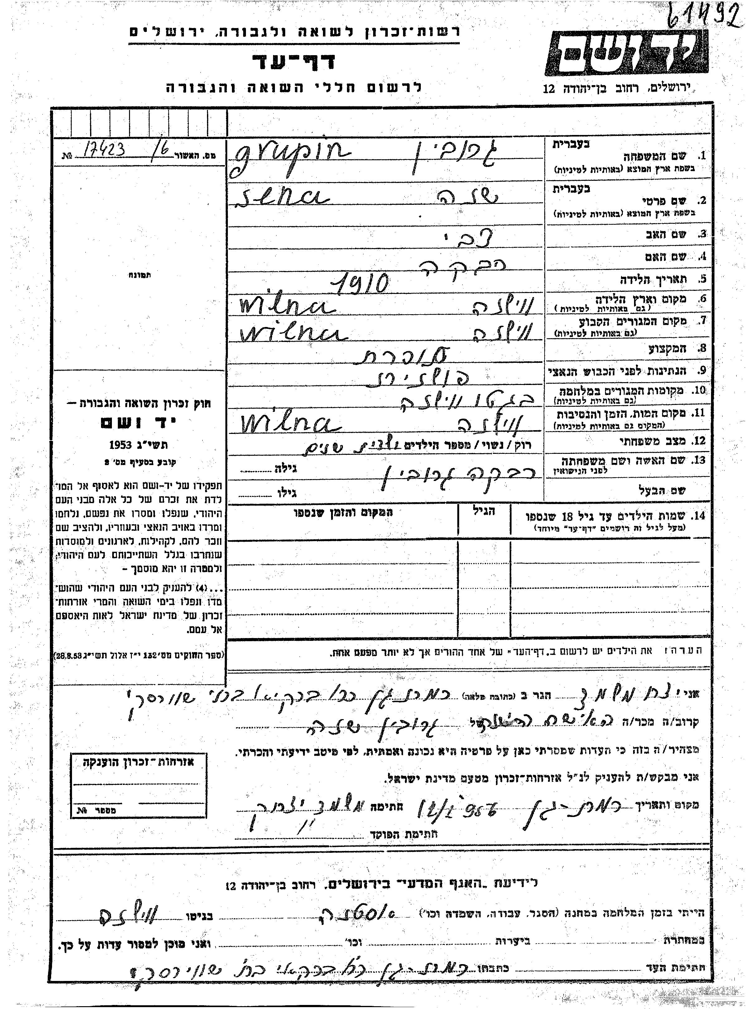 Sena Grupin wurde im Jahr 1910 in Wilna, Polen geboren. Sie war die Tochter von Tzvi und Rivka. Sie war Schneiderin und mit Rivka Verheiratet. Vor dem Zweiten Weltkrieg lebte sie in Wilna, Polen. Während des Krieges war sie in Wilna, Polen.
