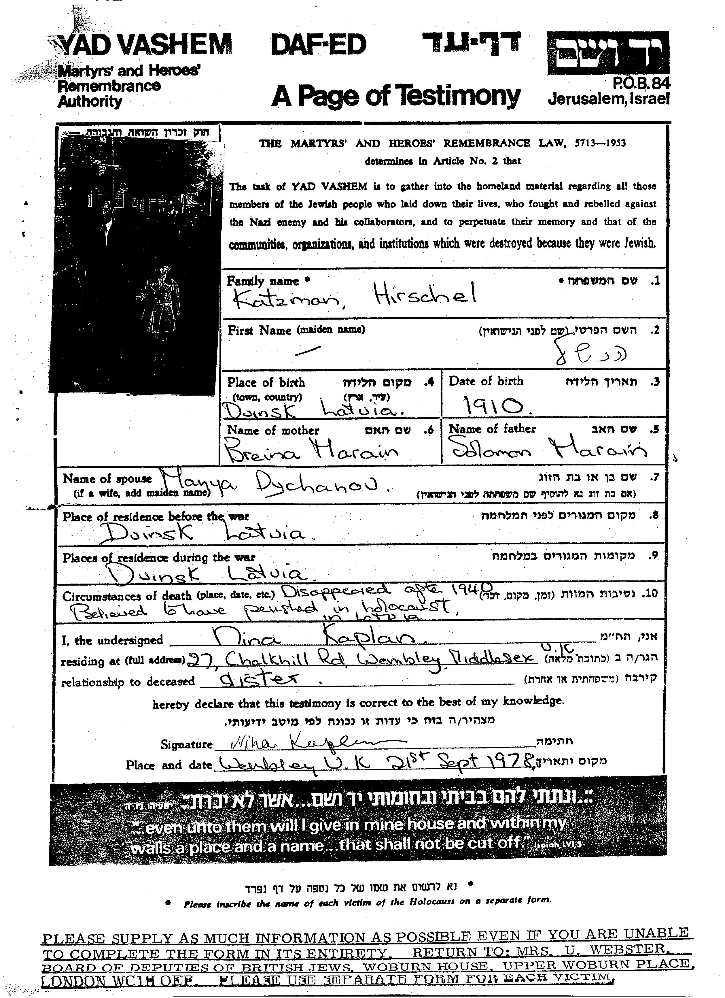 Hirschel Katzman Marain wurde im Jahr 1910 in Dwinsk, Lettland geboren. Er war der Sohn von Salomon und Breina. Er war mit Manya, geb. Dychanow Verheiratet. Vor dem Zweiten Weltkrieg lebte er in Dwinsk, Lettland. Während des Krieges war er in Dwinsk, Lettland.
