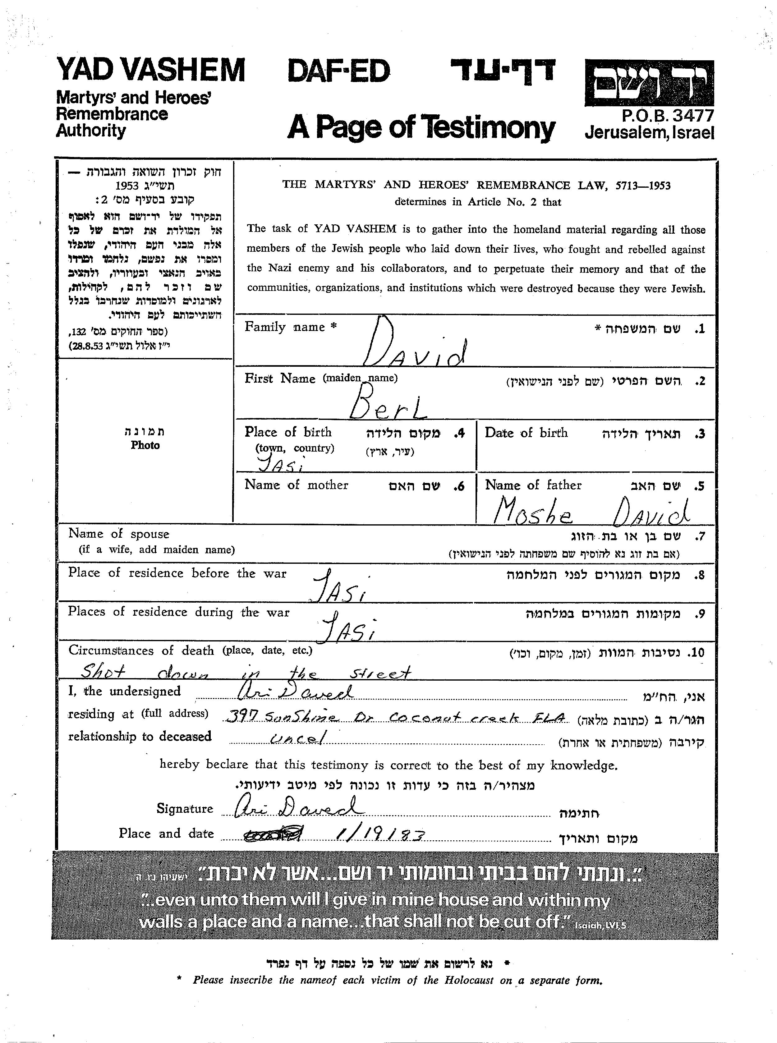 Juden wurden in der Schoah auf verschiedenste Weisen ermordet, unter anderem: Vergasen, Erschiessen, lebendig verbrannt werden, lebendig begraben werden, Tod durch Erschöpfung durch Zwangsarbeit, Epidemien, mangels jeder hygienischer Bedingung oder dem Fehlen medizinischer Versorgung. Manche Juden nahmen sich das Leben, um der Festnahme und weiterer Verfolgung zu entgehen oder ihr hoffnungsloses, nicht nachlassendes Leiden zu beenden.