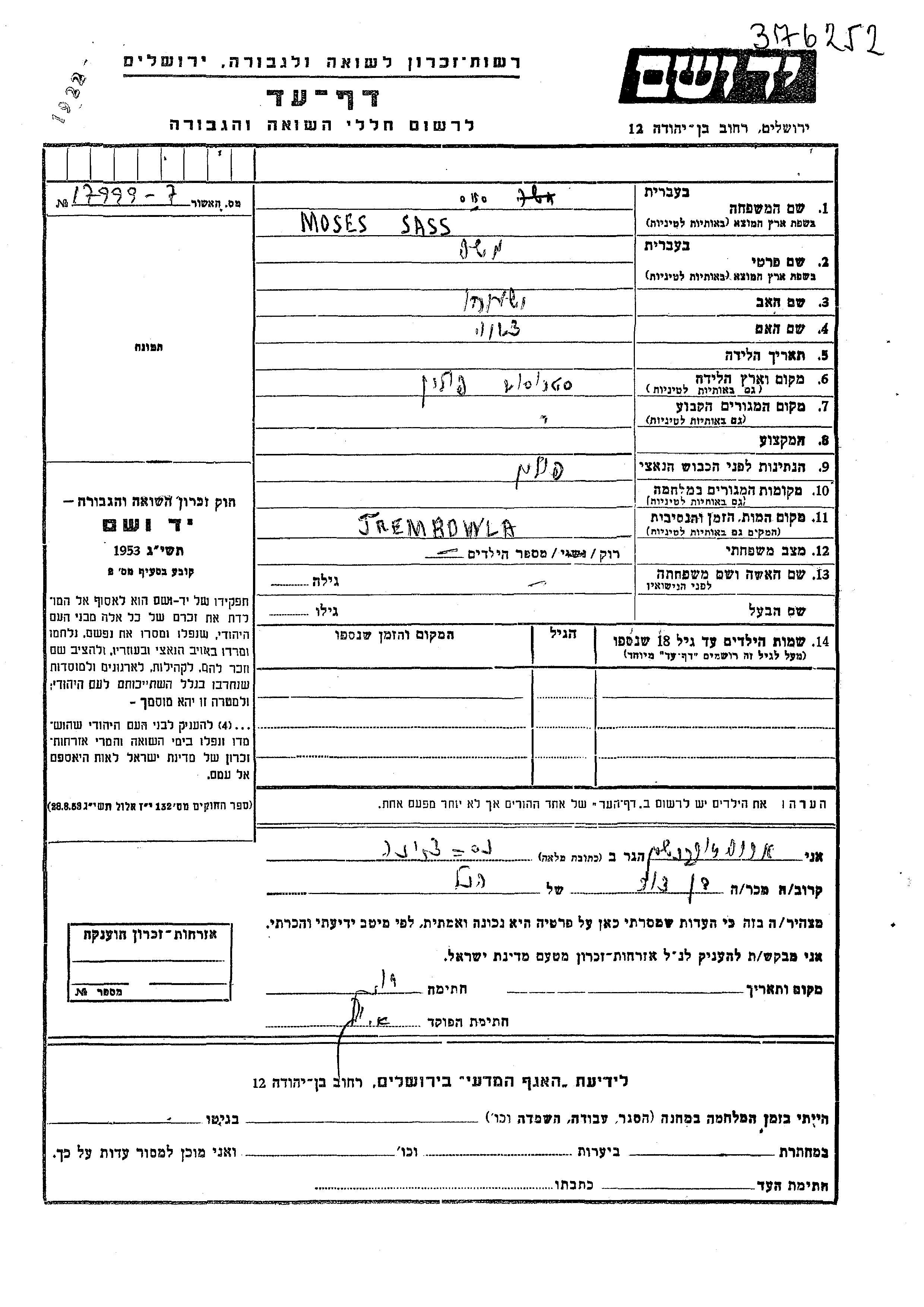Moses Sass Sas wurde in Strusow, Polen geboren. Er war der Sohn von Yeshayahu und Tzvia. Er war Ledig. Vor dem Zweiten Weltkrieg lebte er in Strusow, Polen. Während des Krieges war er in Strusow, Polen.